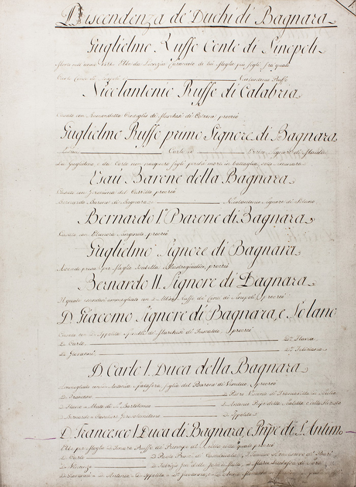 Il manoscritto comprende molte notizie: "Discendenza dei Duchi di Bagnara", acquisti di feudi, eredità, conti economici e "Fondazione delle Commende Gerosolomitane".