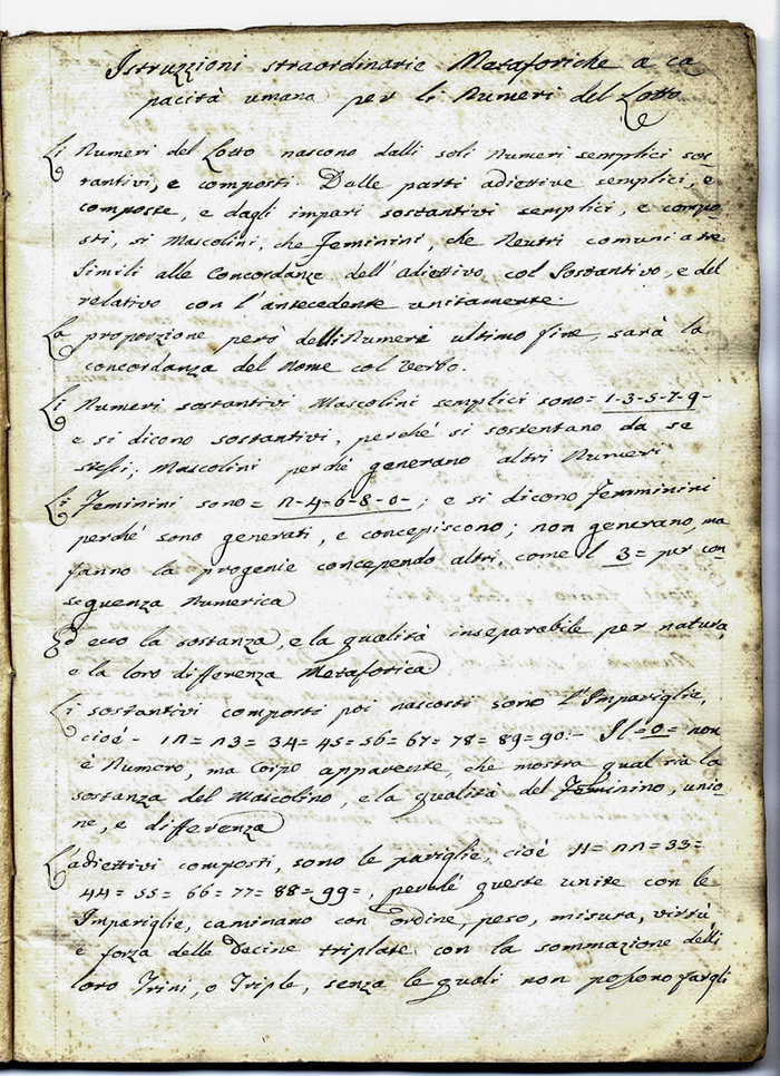 Il testo riporta alcune regole del Lotto redatte dal Benincasa: «Istruzioni straordinarie Metaforiche a capacità umana per li numeri del Lotto», «Vero modo di cavare per ordine li futuri estraendi [...]», «Arte gabalistica di Rosilio».