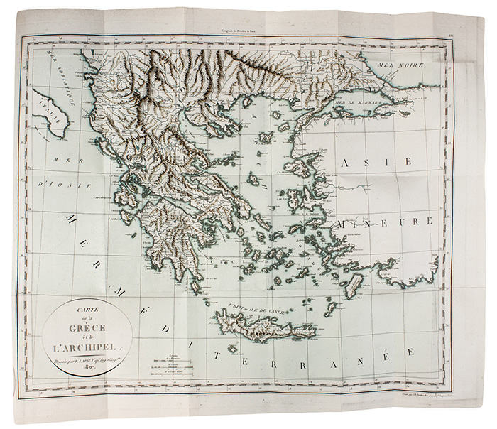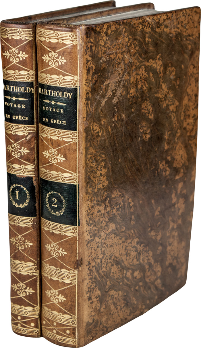 Edizione originale della traduzione dal tedesco ad opera di August Du Coudray, delle lettere del viaggiatore e diplomatico prussiano Bartholdy, che illustra il modo di viaggiare in Grecia e nelle isole dell'arcipelago, impreziosita da 16 belle tavole incise in rame da disegni di Georg Christian Gropius, artista che accompagnò l'Autore nel suo itinerario, di cui 10 di costumi e scene di genere in acquarellatura coeva e 1 grande mappa con i contorni colorati. Atabey 74; Blackmer 87.
