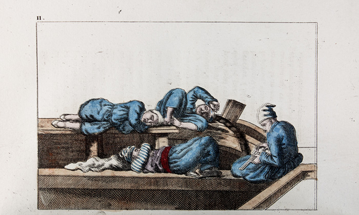 2 volumi in-8° (mm 192X118). Pagine [4], XI, [1], 272; [4], 295, [1] con 16 tavole numerate I-V e VII-XVI, inclusa una grande mappa più volte ripiegata, di cui 10 in acquarellate coeva e 4 tavole di musica, il tutto inciso in rame fuori testo. Ottima copia con solo alcune tracce di sporco a due carte. Legatura coeva in pieno vitello maculato con titoli dorati su tasselli ai dorsi; qualche spellatura ai piatti. Due grandi timbri di collezione privata ai frontespizi. (2)