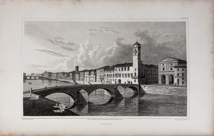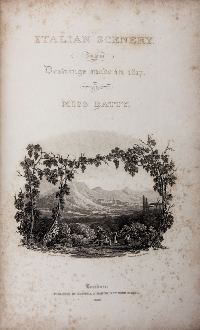 Non comune libro di viaggio. Le incisioni sono tratte dai disegni originali di Elizabeth Batty e raffigurano vedute di città e località italiane. Graesse I, 311; Lowndes VI, 2199.