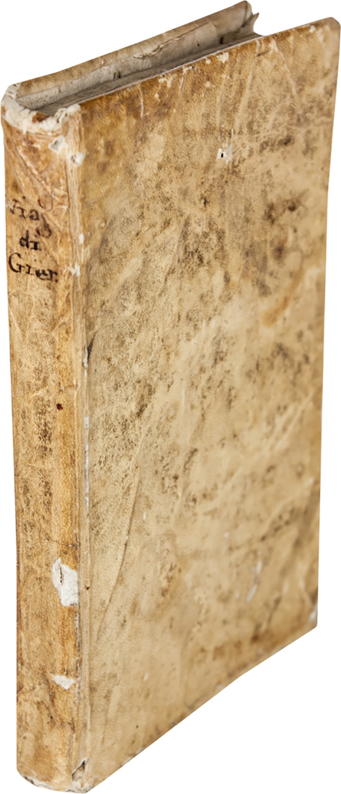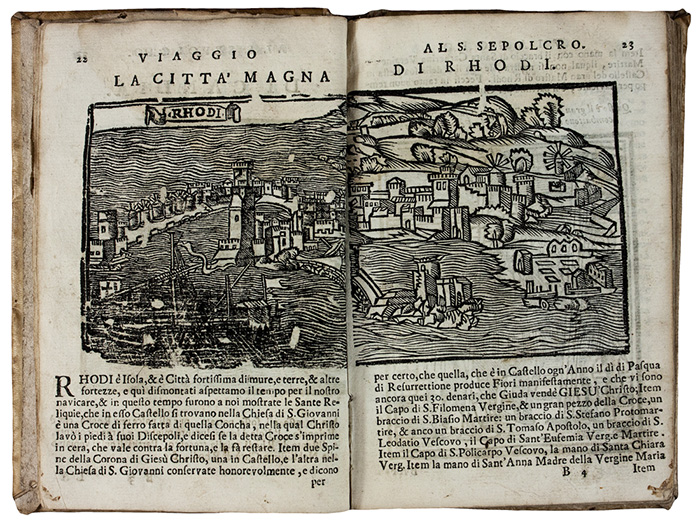 In-12° (mm 160x105). Pagine 192 [i.e. 190]. Frontespizio a inchiostro rosso e nero con mancanza lungo il margine sinistro. Esemplare scompleto delle pagine 9 e 10 e con grande gora d'acqua al margine superiore. Strappo con perdita di testo e incisioni a pagina 7. Numerose incisioni in legno che rappresentano i luoghi visitati durante il viaggio descritto nell'opera. Legatura coeva in piena pergamena con abrasioni ai piatti e al dorso e minuscolo forellino di tarlo al piatto anteriore.