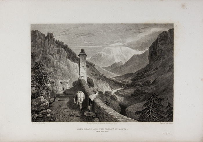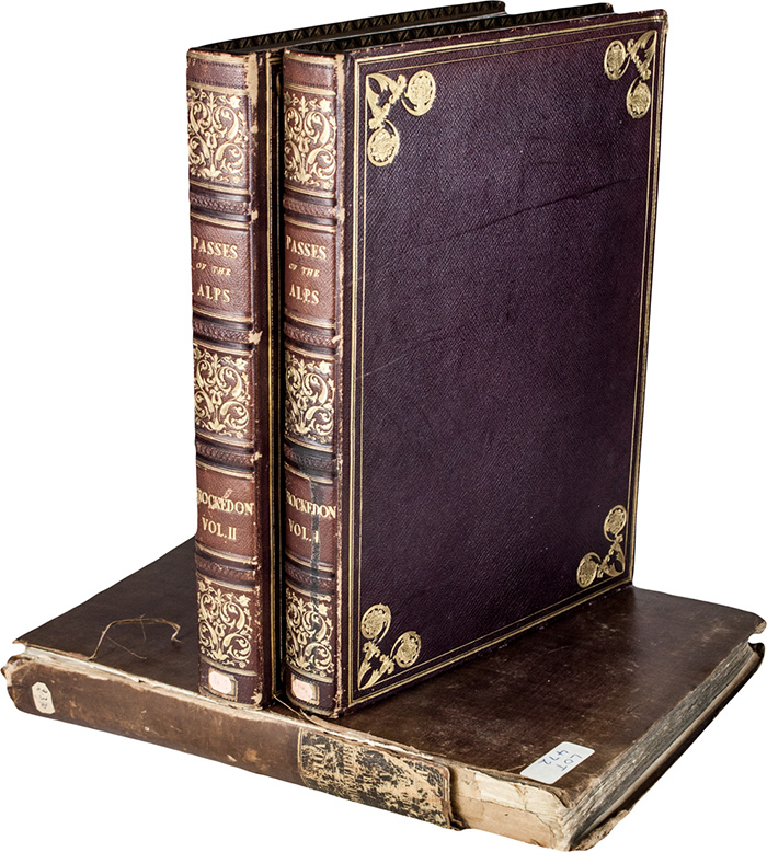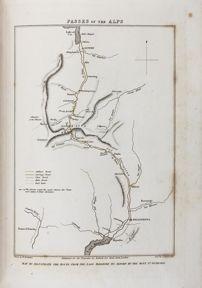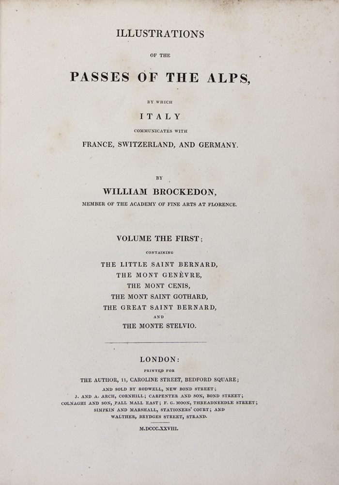Prima edizione. Vi sono descritti oltre 40 diversi itinerari attraverso le Alpi percorsi dall'Autore in circa 60 attraversamenti, raffigurati in splendide incisioni e da disegni dello stesso Brockedon. Cfr. Graesse I, 545, Perret 723.