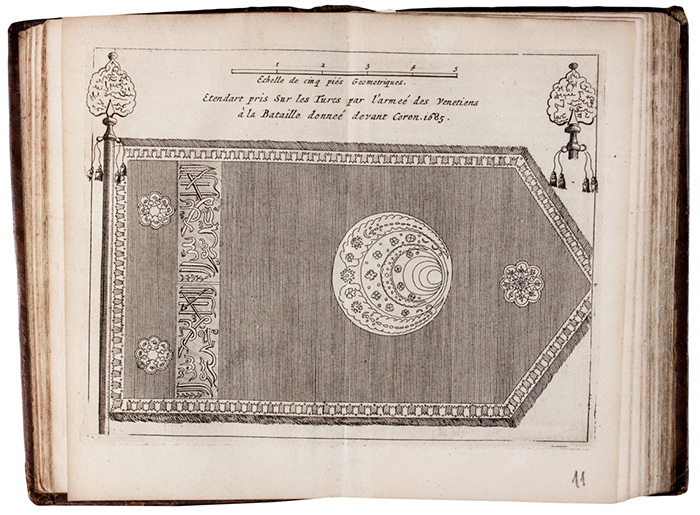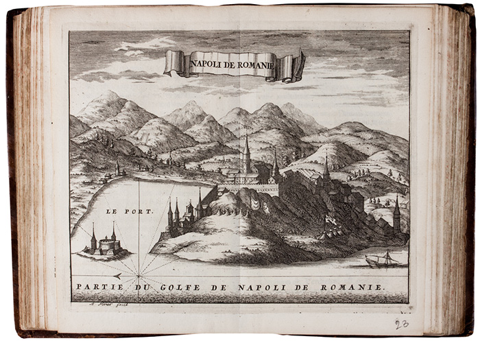 In-8° (mm 152x95). Pagine [4], 232, [2]. Completo delle 42 belle tavole fuori testo incise in rame a doppia pagina raffiguranti piante e vedute di alcune località adriatiche e balcaniche tra cui Patrasso, Navarino, Modone, Corfù, Zante, Lepanto, Atene, etc. Alcuni strappetti marginali ad alcune carte di testo e di tavole, un piccolo forellino con perdita di inciso a una delle tavole. Legatura coeva in pieno vitello, con spellature e abrasioni.