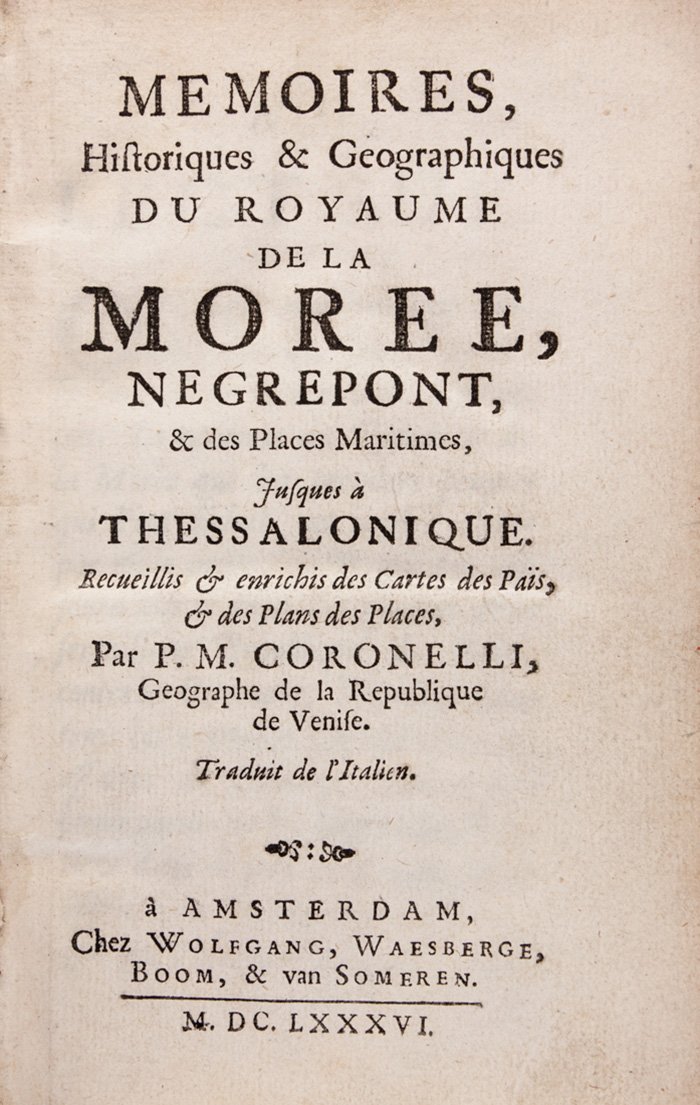 Coronelli Vincenzo Maria, Memoires historiques & geographiques du Royaume de la Moree, Negrepont & des places maritimes, jusques à Thessalonique...