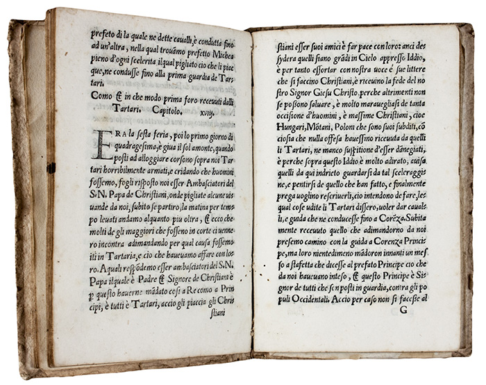 Prima edizione (purtroppo scompleta) di questo rarissimo racconto di viaggio, in seguito incluso nella seconda edizione del secondo volume delle Navigationi et viaggi del Ramusio. Contiene i resoconti dei viaggi di Giovanni da Pian del Carpine, il primo europeo ad essere ricevuto alla corte del Khan, e di Simon de Saint Quentin, inviato presso i Tartari con il confratello Anselmo l'anno successivo. Cfr. Amat di San Filippo 3-4: «Prima edizione italiana di questo prezioso viaggio. Assai rara». Giovanni da Pian del Carpine, uno dei primi discepoli di san Francesco, fu inviato nel 1245 da Innocenzo IV come legato presso i Tartari nel tentativo di scongiurare una ripresa delle invasioni ma soprattutto con l'incarico di raccogliere il maggior numero di informazioni su questo sconosciuto popolo bellicoso.