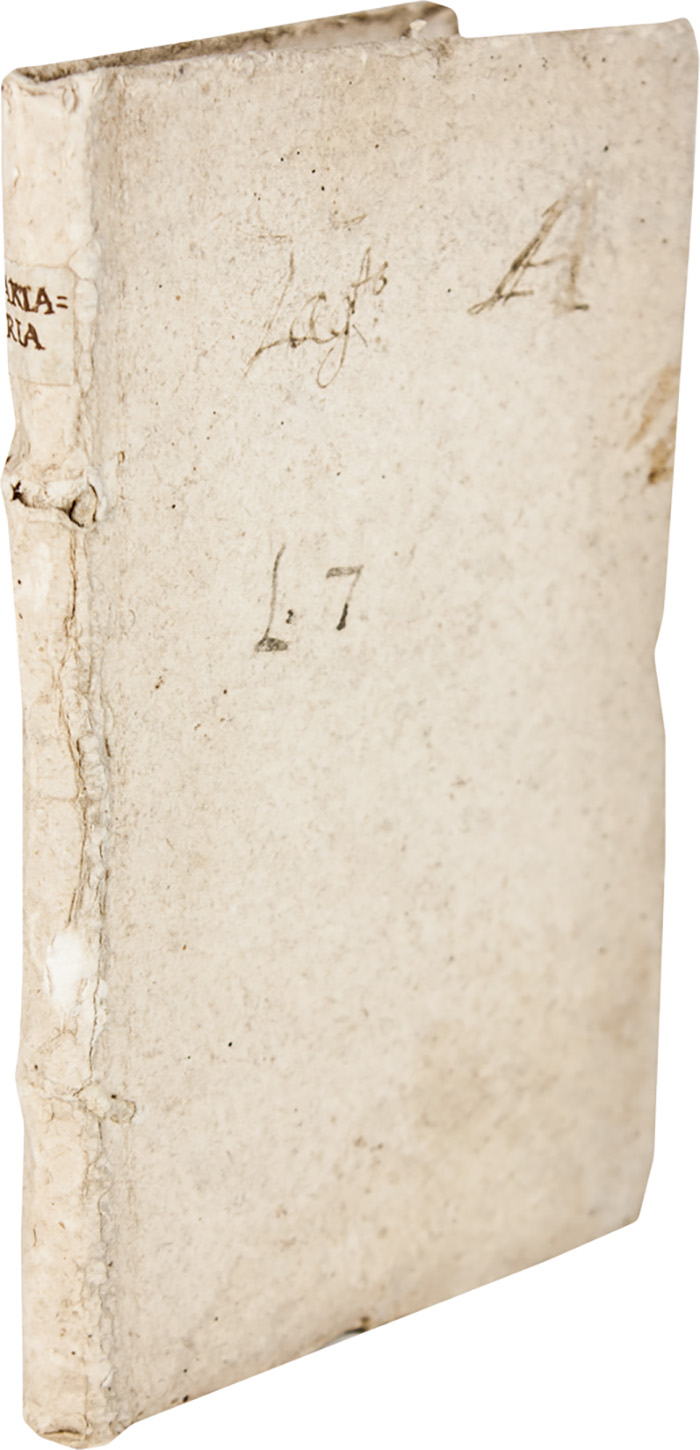 In-8° (mm 150x100). Carte [54] (di 56), mancano la prima e ultima carta contenenti frontespizio e colophon. Due carte conservate slegate all'interno, forellini di tarlo sparsi perlopiù lontani dal testo, tranne che nell'ultimo fascicolo dove ledono molte lettere. Cartonato rustico posteriore con titoli manoscritti su tassello cartaceo al dorso.