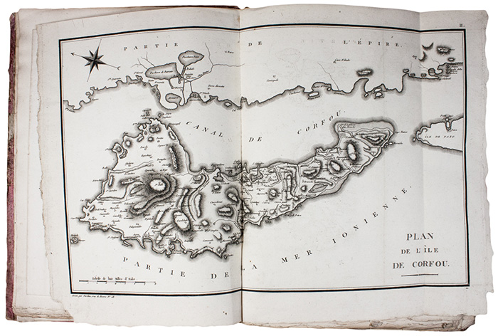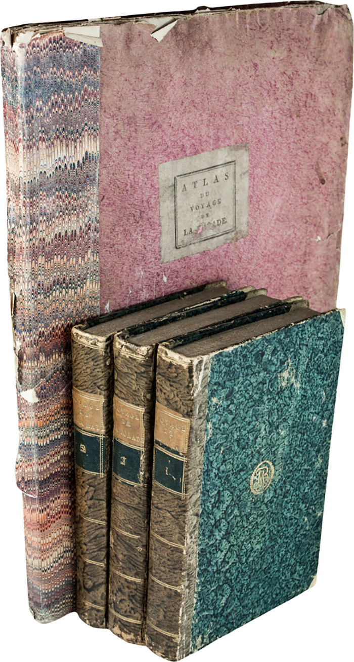 3 volumi di testo in-8° (mm 194x120) e 1 volume di atlante in-4° grande (mm 350x260). Pagine XVIII, 303, [1]; [4], 332; [4], 315, [1]; [2], 14 con 29 carte con 37 tavole e mappe numerate incise in rame e anche ripiegate. Il volume dell'atlante un po' allentato ma completo e in barbe. Legature dei volumi di testo e dell'atlante non omogenee, in mezzo cartone verde marmorizzato con monogramma impresso in oro ai piatti le prime, in mezzo cartone rosa decorato con titoli su tassello cartaceo al piatto anteriore l'atlante. Ex-libris Lavergne ai contropiatti dei primi tre tomi. (4)