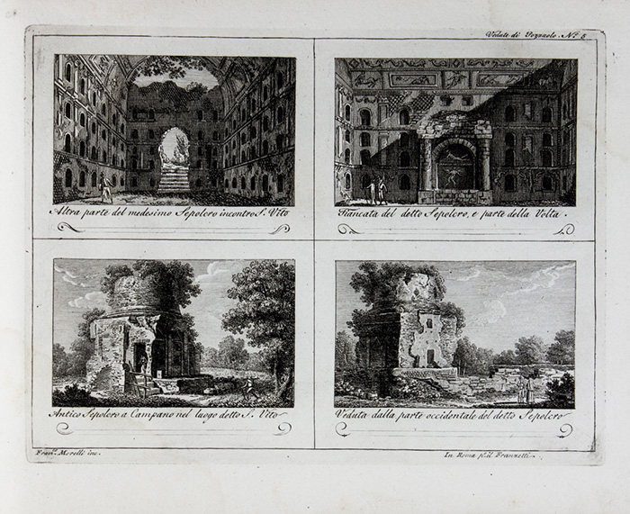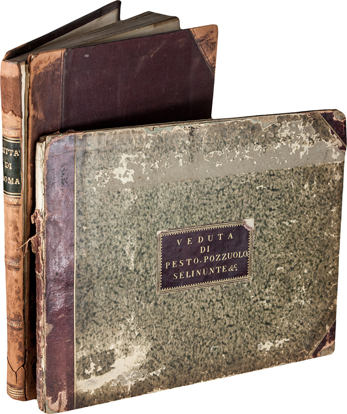 Album in-8° oblungo (mm 202x262). 1 frontespizio tipografico, 1 veduta da Filippo Hackert e 7 carte di tavole numerate ciascuna con 4 piccole vedute incise in rame da Morelli. LEGATO CON: Id., Raccolta degli antichi monumenti esistenti fra Pozzuolo Cuma e Baja... In Roma: Agapito Franzetti, s.d. 1 frontespizio tipografico, 1 veduta da Filippo Hackert e 9 (di 10) carte di tavole numerate ciascuna con 4 piccole vedute calcografiche. LEGATO CON: Id., Raccolta degli antichi monumenti esistenti fra Girgenti Segesta e Selinunte... In Roma: Agapito Franzetti, s.d. 1 frontespizio tipografico, 1 veduta da Filippo Hackert e 4 carte di tavole numerate + 4 da altra opera ciascuna con 4 piccole vedute calcografiche. Gora d'acqua nell'angolo superiore delle carte. Legatura coeva in mezza pelle con punte, lisa. SI AGGIUNGE: Parboni Achille-Parboni Pietro, Nuova raccolta di cento vedute antiche e moderne della città di Roma e sue vicinanze. Roma: presso Giacomo Antonelli, 1831. In-4° (mm 253x190). 1 frontespizio e 50 carte di tavole ciascuna con 2 vedute incise in rame. Angolo inferiore del frontespizio ricostruito e fioriture sparse. Legatura coeva in mezza pelle con punte, lisa e con piatto anteriore staccato. (2)