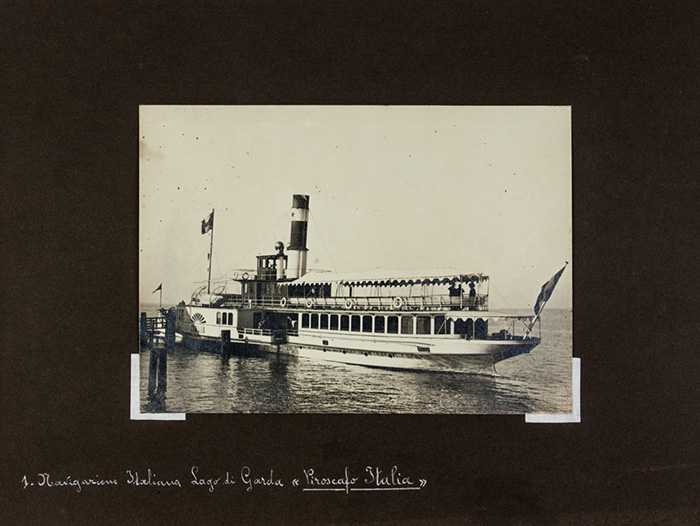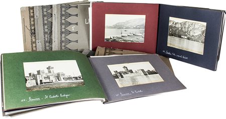 8 album (mm 230x320) rilegati in brossura con laccio composti di 12 fogli di cartoncino colorato ciascuno, contenenti complessivamente 202 fotografie formato 130x180 mm stampate su carta con sviluppo in gelatina cloruro-bromuro d’argento, i fogli sono corredati di didascalia e datazione manoscritta dell’autore. Agli album è allegata una relazione dattiloscritta di Alessandro Oppi con una mappa del Lago di Garda indicante l’itinerario e le località fotografate. (8)