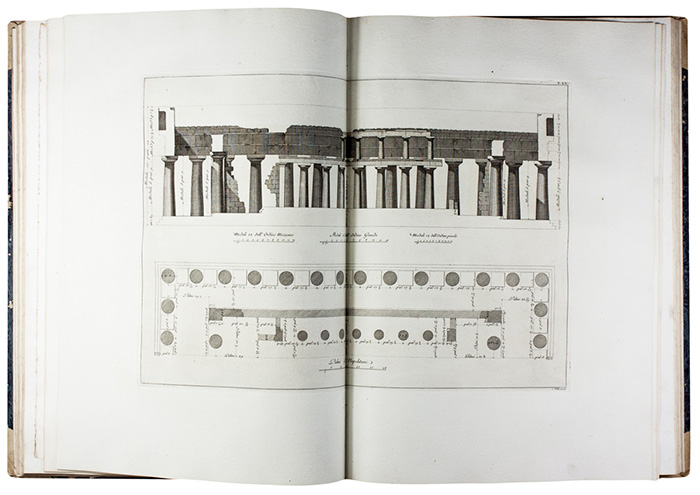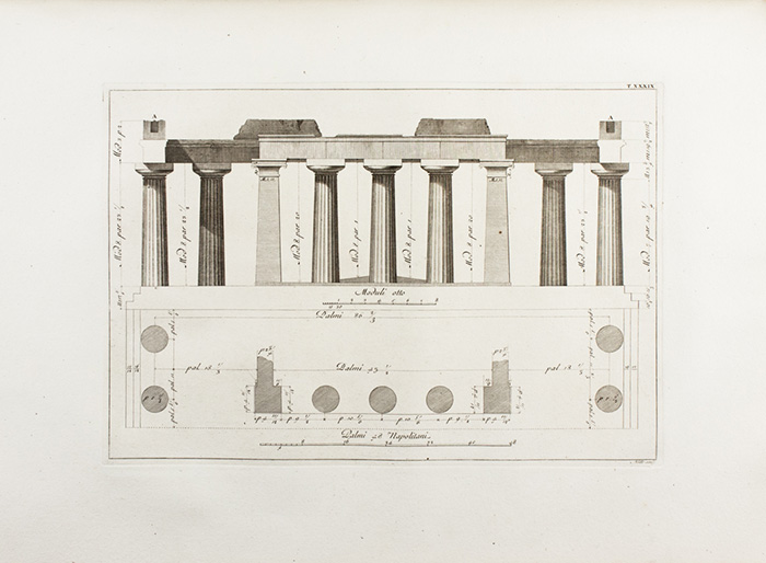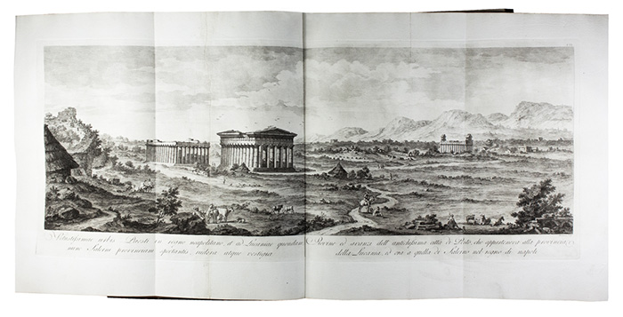 In-folio (mm 494x350). Pagine [6] (due frontespizi figurati, in latino e in italiano, e antiporta con ritratto di Carlo III), 181, [1]. Con nel complesso 60 (di 65) illustrazioni finemente incise in rame e numerate I-LXV, di cui 16 nel testo a mo' di testatine e finalini, 39 (di 44) a piena pagina fuori testo, 5 a doppia pagina di cui una anche ripiegata. Esemplare scompleto di 5 tavole ma buona copia in carta forte azzurrina, con solo forellini di tarlo marginali iniziali e in fine di volume, alcune carte con arrossature e uno strappo riparato lungo la piegatura di tavola IX, la grande veduta delle rovine di Pesto, altro strappo al centro della tavola XLV e altre con minuscoli forellini di tarlo. Legatura ottocentesca in mezza pergamena con punte e piatti marmorizzati, titoli e decori impressi in oro al dorso. Conservate sciolte all'interno 3 tavole in carta normale, di cui 2 'in sostituzione' delle rispettive tavole mancanti.