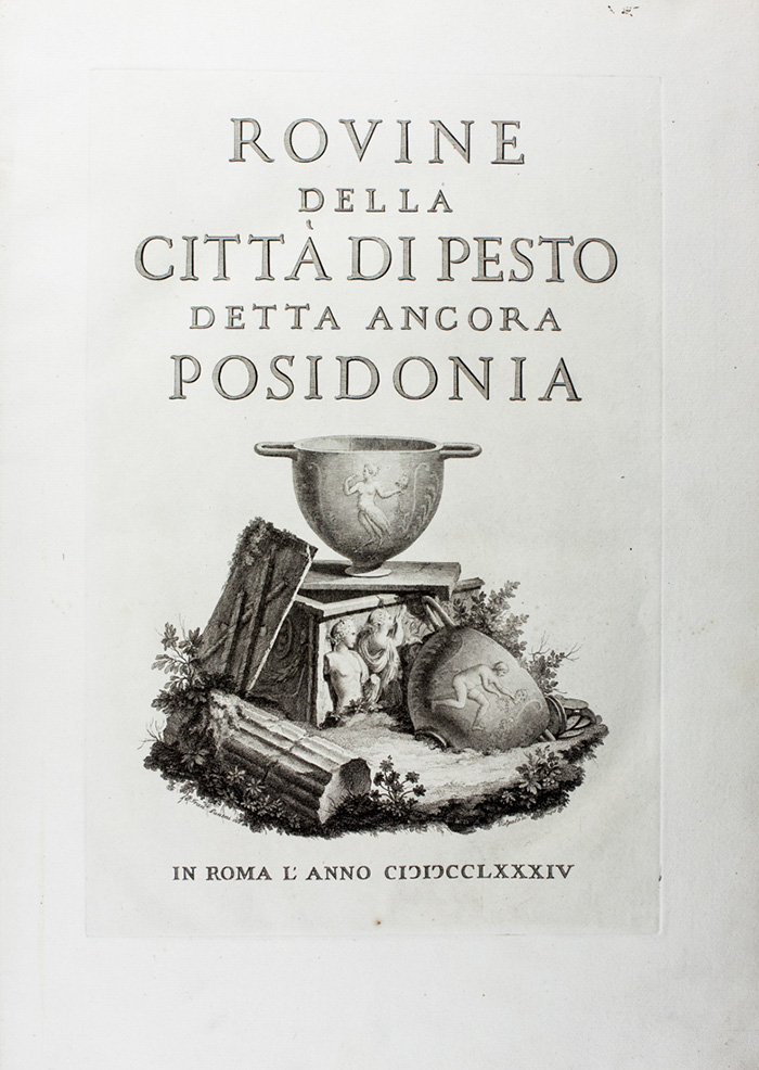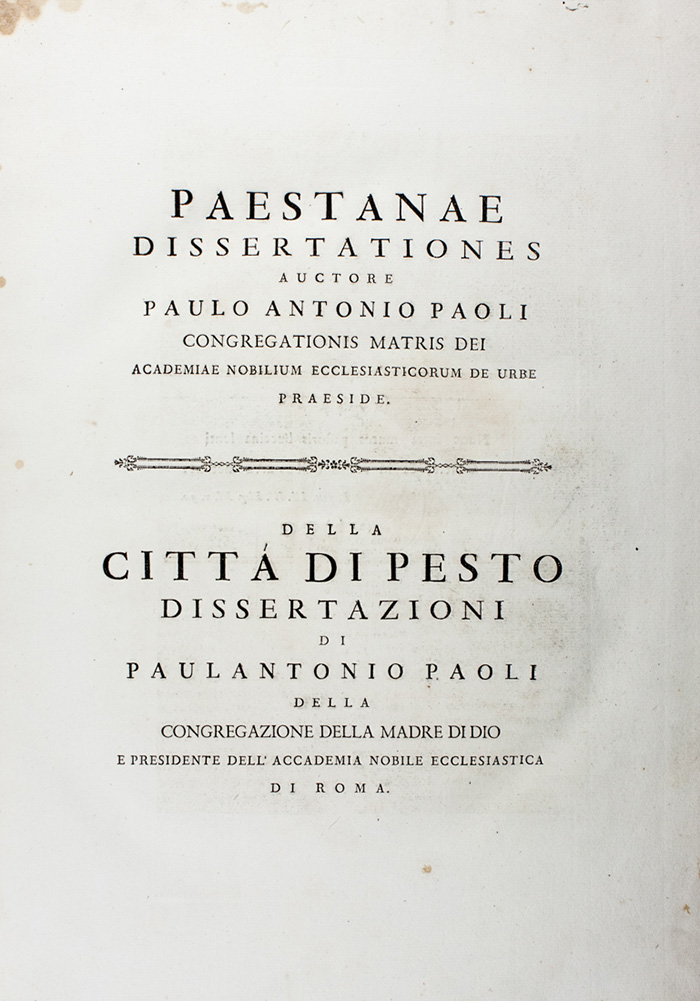 Edizione originale, la nostra copia con testo e tavole in carta forte azzurrina, purtroppo scompleta di 5 tavole. La prima raffigurazione delle rovine di Peastum, rinvenute tra il 1750 e il 1758 dall'architetto Soufflot e dall'archeologo Winckelman, si deve a Thomas Major, che pubblicò l'opera The ruins of Paestum a Londra nel 1768. Tuttavia, come sottolinea Cicognara 2693 l'opera del Paoli è molto più esatta, sia per il testo che per le splendide tavole eseguite dai migliori artisti del tempo: Bartolozzi, Volpato, la Marra, Nolli, Polanzani, Baratti, Pignatoni su disegni di Tiepolo, Panini, Rajola, Nicole e Dominici. Berlin Kat. 1905; Brunet V, 308; Comolli I, 265.