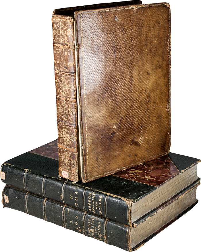 In-4° (mm 270x205). Pagine VIII, 501, [1], [62], 537-571, [5]. Con 2 mappe più volte ripiegate e 52 tavole incise in rame fuori testo, di cui 32 raffiguranti gli Itinerant Traders of London da William Marshall Craig in coloritura coeva. Fioriture sparse e gore d'acqua lungo il volume me nel complesso discreta conservazione interna. Legatura inglese coeva in pieno vitello nocciola con entrambi i piatti staccati. SI AGGIUNGE Angus William, Seats of the Nobility and Gentry in Great Britain and Wales in a collection of Select Views... Islington: Angus, 1787 [ma 1815]. 2 parti in 1 volume in-4° oblungo (mm 206x266). Carte [4] con occhietto, frontespizio, indice generale delle tavole e indice del primo volume (dopo tavola 48) più 63 tavole numerate di vedute incise in rame, ognuna con un foglio di spiegazione e protette da velina. Legati all'interno gli avvisi dell'Autore ai sottoscrittori. Legatura coeva in marocchino rosso a grana media con ampie decorazioni ai piatti e al dorso. SI AGGIUNGE: Turner Joseph Mallord Williame, Picturesque Views on the Southern Coast of England from Drawings made Principally by Turner and Engraved by W.B.Cooke, George Cooke... London: John and Arthur Arch..., 1826. In-4° (mm 295x220). Carte [112] con 48 tavole a piena pagina e 32 vignette nel testo. Alcuni fascicoli bruniti, gore d'acqua sparse, piatti della legatura internamente allentati e strappo riparato a una vignetta. Legatura coeva in piena pelle con cornice a motivi fogliati impressa ai piatti, cerniere ed estremità dei piatti lise. SI AGGIUNGE: Brayley Edward Wedlake, A topographical history of Surrey... Dorking: Robert Best; London: Tilt and Bogue, 1841. 5 volumi. (8)