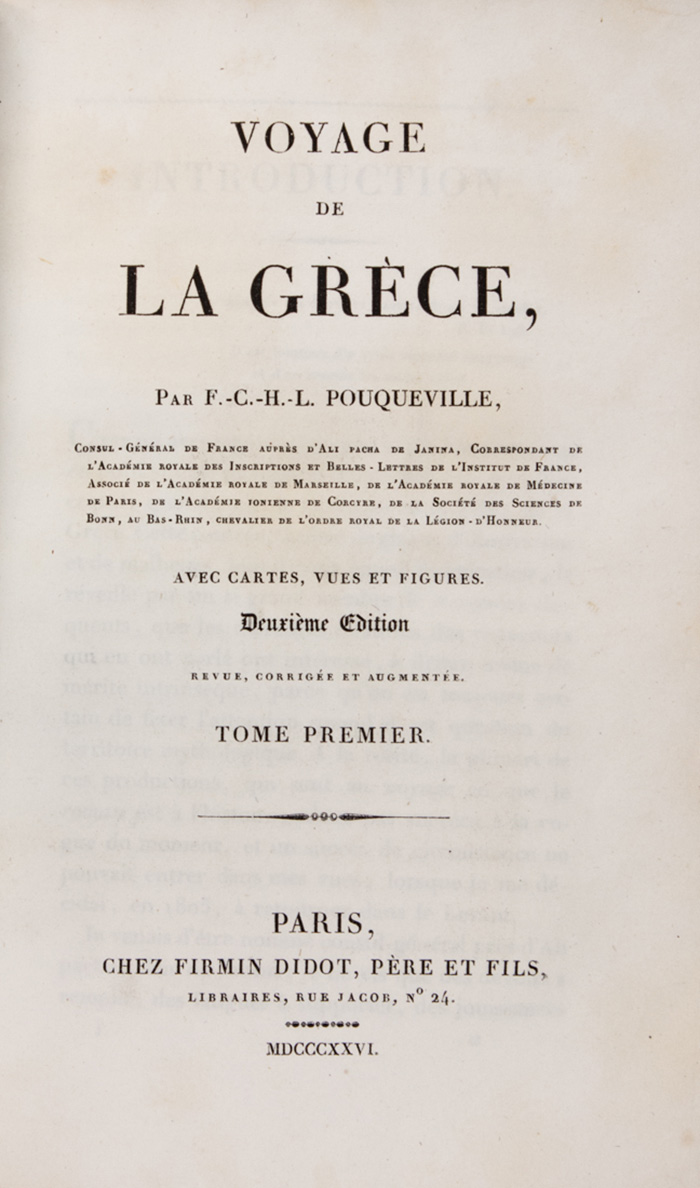 Seconda e migliore edizione dell'opera più completa sino ad allora pubblicata sulla Grecia. Pouqueville, fatto prigioniero dai Turchi dal 1799 al 1801, al rientro in Francia scrisse questa importante opera di chiaro stampo filoellenico. Atabey 991 «much enlarged and [...] with many more plates»; Blackmer 1346; Brunet IV, 850 ne parla come della migliore e più completa opera sulla Grecia moderna.