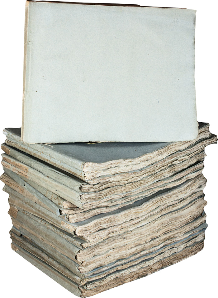 Raccolta di 21 volumi in-4° oblungo (mm 345x260) in barbe legati in brossura coeva azzurra delle Journées Pittoresque des Edifices de Rome Ancienne, alcuni con titolo su tassello cartaceo al dorso. Con quasi 600 incisioni a piena pagina e molte anche ripiegate, di cui 166 acquerellate in bicromia, 5 tavole all'acquatinta e 1 pianta del Foro romano a doppia pagina stampata in rosso e nero. Testo in italiano e francese. Ottime copie. (21)