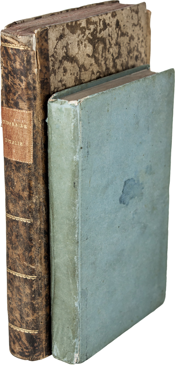 In-8° (mm 200x130). Pagine 208 con 26 carte geografiche ripiegate fuori testo. Grande gora ad alcune carte centrali e lievi fioriture sporadiche, altrimenti buono stato di conservazione. Legatura coeva in mezza pelle con tassello con titoli al dorso. Mancanze lungo le cerniere e alle cuffie e minime abrasioni ai piatti. SI AGGIUNGE: Vasi Mariano, Itineraire instructif de Rome à Naples. Naples: Chez I. George Glass, 1841. In-12° (mm 160x100). Pagine 374 con 6 illustrazioni fuori testo. Ottimo esemplare con minime fioriture. Legatura in cartone con macchia al piatto anteriore e difetti lungo le cerniere. (2)