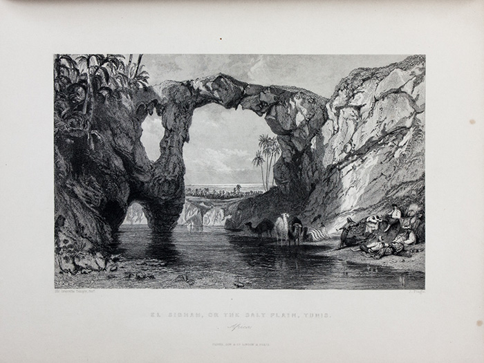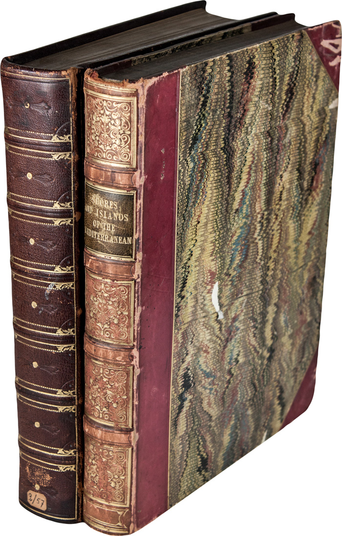 In-4° (mm 265x207). Pagine 154, [2] + 1 frontespizio figurato, 63 belle tavole di vedute protette da veline e a una mappa più volte ripiegata incisi in acciaio. Lieve ingiallimento della carta, due veline parzialmente rimosse e alcune fioriture in fine del volume ma bella copia. Legatura coeva in mezza pelle rossa con punte e piatti in carta marmorizzata, con spellature e altri segni del tempo. SI AGGIUNGE: Malagoli Vecchi Marco-Pellé Clément, Il Mediterraneo illustrato le sue isole e le sue spiagge: comprendente la Sicilia, la costa di Barberia, la Calabria, Gibilterra, Malta... Firenze: presso Spirito Batelli, 1841. In-4° (mm 265x192). Pagine 510, [2] con 61 (di 64) tavole di vedute incise in acciaio, incluso il frontespizio. Fioriture a bruniture sparse, a tratti intense. Legatura coeva in piena percallina marrone con titoli e cornice di duplice filetto impressa in oro ai piatti. (2)