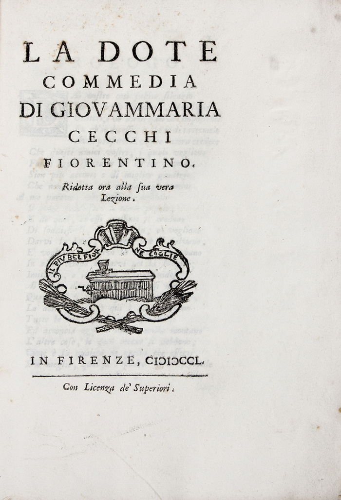 Rara raccolta delle più celebri commedie in prosa e poesia del Rinascimento fiorentino, una delle quali è qui in prima edizione: L'arzigogolo del Lasca. I primi due tomi sono dedicati alle opere di Giovanni Maria Cecchi: (I tomo) La dote, La moglie, Gl'incantesimi, La stiava; (II tomo) I dissimili, L'assiuolo, Il servigiale. Il terzo e quarto tomo raccolgono le commedie di Anton Francesco Grazzini detto il Lasca: (III tomo) La Gelosia, La spiritata, I parentadi; (IV tomo) La strega, La sibilla, La pinzochera, L'arzigogolo. Il quinto tomo contiene le opere di Francesco D'Ambra: Il furto, I Bernardi, La cofanaria; Descrizione degl'intermedj rappresentati colla commedia nelle nozze... Il sesto tomo contiene le commedie Il granchio e La spina di Leonardo Salviati, e La Tancia di Michelagnolo Buonarroti. La Cofanaria - con gli Intermedi di Giovanbattista Cini - contiene l'importante lettera dedicatoria di Alessandro Ceccherelli sulla struttura e sulle funzioni della commedia. Cfr. Brunet V, 687; Clubb 5; Gamba 991; Graesse VI, 2; Parenti 89; Razzolini-Bacchi della Lega 346-47.