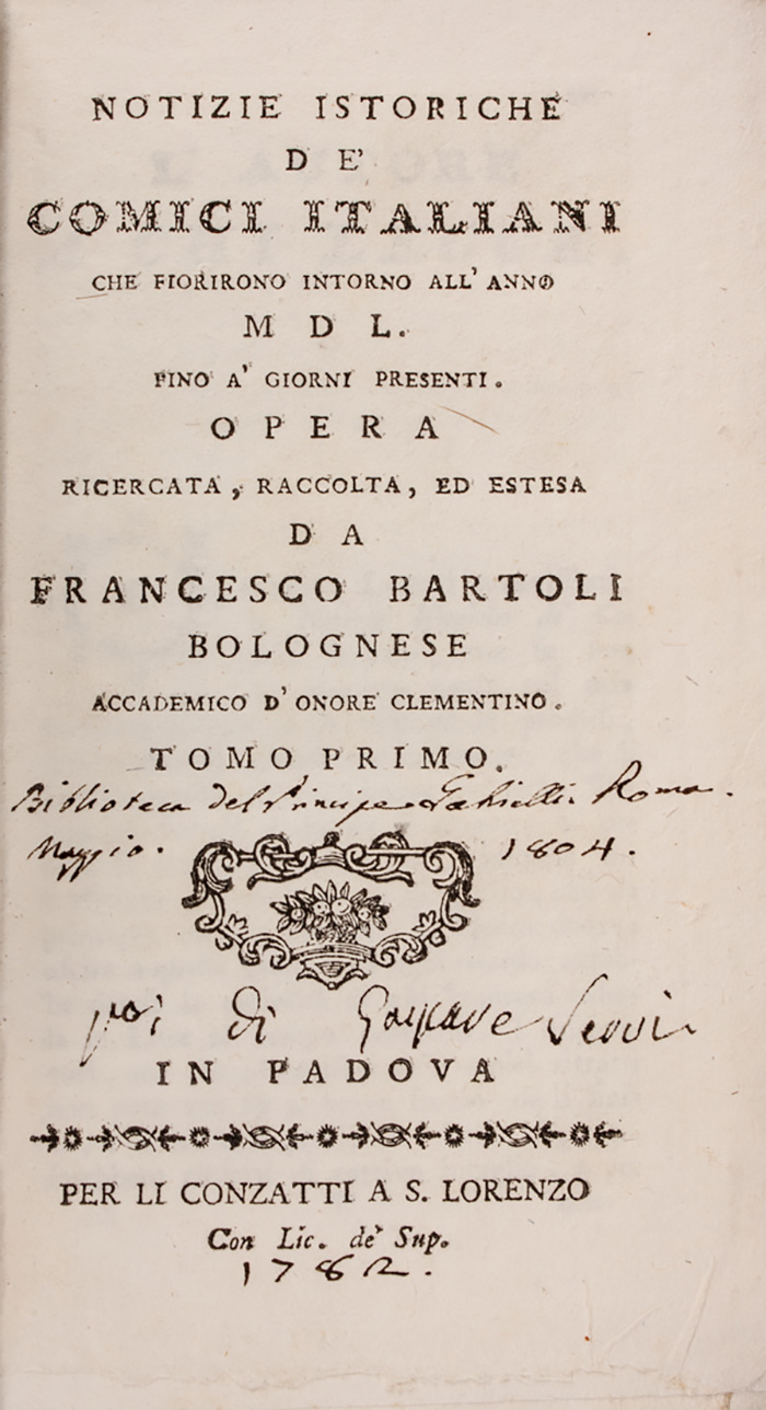 Bartoli FrancescoNotizie istoriche de' comici italiani che fiorirono intorno all'anno MDL fino a' giorni presenti [...]. Tomo primo (-secondo).