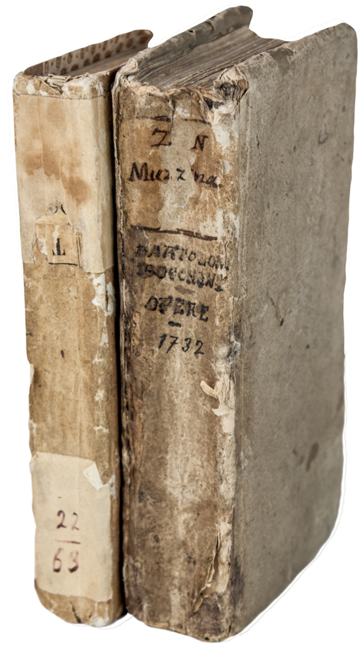In-12° (mm 140x75). Pagine 299, [1]. Vignetta xilografica al frontespizio. Allentato internamente e con una piccola mancanza nel margine inferiore dell'occhietto ma buona copia. Cartonato muto settecentesco con piatti in carta marmorizzata, piccole lacune ai piatti e difetti al dorso. Note di mano dell'erudito Fortunato Benigni all'occhietto, al frontespizio e a un'altra carta. SI AGGIUNGE: Id., Opere di Bartolomeo Bocchini, detto Zan Muzzina. In quest'ultima impressione ridotte in un sol volume. In Bologna: per Costantino Pisarri, 1732. In-12° (mm 14x72). Pagine 407, [1]. Vignetta raffigurante tre Maschere della Commedia dell'Arte incisa in legno al frontespizio, finalini xilografici. Minime mende. Legatura coeva in cartonato con titoli manoscritti al dorso; restauro alla cerniera posteriore e piccole lacune riparate al dorso. (2)