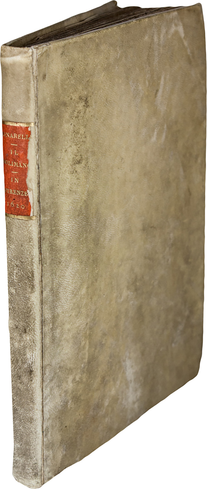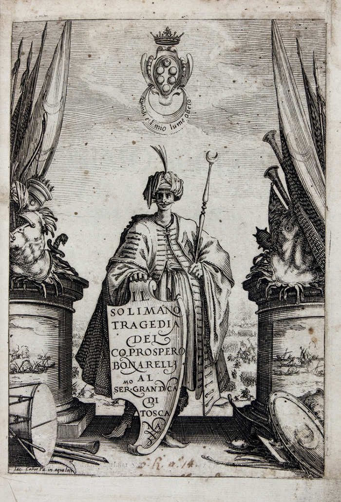 Prima ricercatissima edizione delle tavole del Callot. Rappresentata per la prima volta ad Ancona nel 1618, questa fortunata opera teatrale capolavoro del Bonarelli era stata data alle stampe senza alcun corredo iconografico nel 1619. Nel 1620 viene stampata con le splendide illustrazioni del Callot, l'artista che ha tramandato la testimonianza figurativa dei fastosi spettacoli dei Medici tra Cinque e Seicento; le incisioni, oltre al frontespizio raffigurante il Solimano, riproducono le scene ideate da Giulio Parigi dove Firenze diviene l'Aleppo del dramma. Parigi utilizza un impianto prospettico con tre punti di fuga, sul modello di quello realizzato dal Buontalenti e della scena del Teatro Olimpico di Vicenza, ma impiega scene mobili, preludio al virtuosistico teatro barocco. Cfr. Allacci 729; Berlin Kat. 4412; Cairo-Quilici 3815; Cicognara 1086; Gamba 1810; Piantanida 3870: «Tragedia in cinque atti, una delle più importanti ed interessanti del secolo XVII, assai ricercata per la bella veste tipografica». Manca a Clubb, Boffito e Bruni-Evans. La nostra copia ha legato in principio un ritratto di Callot inciso da Edme de Boulonois da disegno di A. van Dyck.