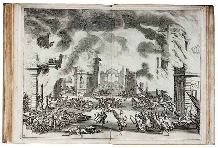 In-4° (mm 220x155). Pagine [4], [12], 162, [2] con un frontespizio allegorico e 5 splendide tavole a doppia pagina fuori testo riproducenti le scenografie della tragedia, finemente incisi in rame da Callot. Marca dello stampatore in fine e fregi tipografici al testo incisi in legno. La nostra copia ha legate in principio del volume due carte, di cui una bianca e l'altra fittamente manoscritta, e 1 tavola con il ritratto di Callot. Fioriture sparse, occasionalmente più marcate, qualche forellino di tarlo anche restaurato e lacuna nel margine inferiore del frontespizio anticamente riparata ma bella copia. Legatura ottocentesca in pergamena con titoli dorati su tassello al dorso, piatto anteriore rimontato e con difetti. Due diversi ex-libris applicati al contropiatto anteriore.