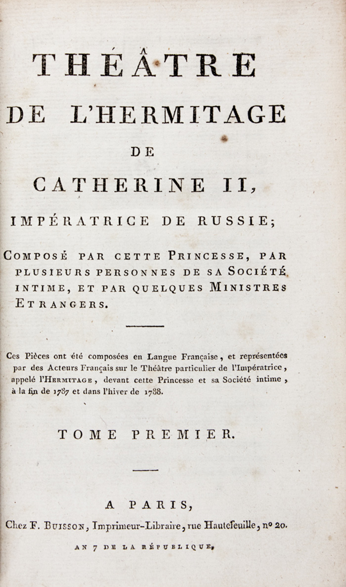 Prima edizione francese di questa raccolta di 19 commedie - in larga parte in forma di proverbi - edita da Jean Henri Castéra, opera di Caterina II e del suo entourage. Le pièces teatrali, come indicato nel titolo, furono rappresentate da «acteurs français sur le théâtre particulier de l’Impératrice, appelé l’Hermitage, devant cette princesse et sa société intime, à la fin de 1787 et dans l’hiver de 1788». Cfr. Barbier IV, 688-689; Graesse II, 80.