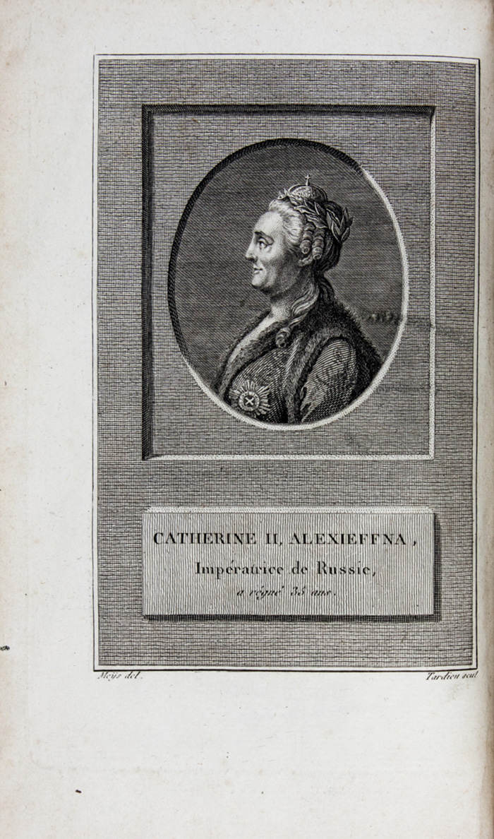 2 volumi in-8° (mm 196x118). Pagine [4], 428; [4], 432 con 1 ritratto di Caterina II in antiporta inciso in rame da Tardieu. Qualche lieve fioritura sparsa ma buona copia. Legatura coeva in vitello marmorizzato con titoli dorati su tasselli al dorso decorato in oro; lievi danni alle estremità dei dorsi e ad alcuni angoli. (2)