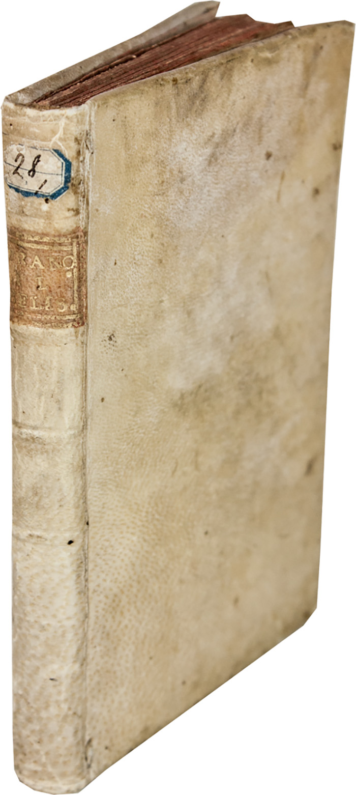 In-8° (mm 145x100). Pagine [16], 208. Vignetta xilografica al frontespizio, capilettera e fregi incisi in legno nel testo. Esemplare rifilato, con fioriture sparse e una gora d'acqua marginale nella seconda parte del volume, con un forellino di tarlo marginale a circa 20 carte e con una piccola mancanza a carta D1 che lede seppur di poco il testo. Legatura settecentesca in piena pergamena con titoli stampati in oro su falso tassello al dorso.