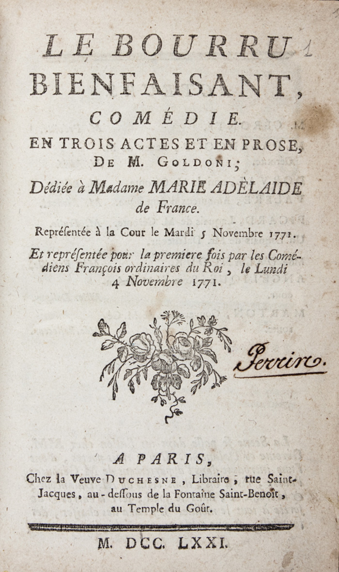Goldoni Carlo, Le Bourru Bienfaisant, comédie. En trois actes et en prose [...]; Dédiée à Madame Marie-Adelaïde de France...