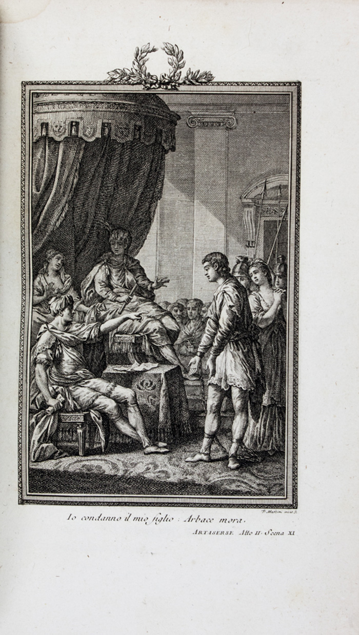 Lussuosa edizione curata da Pezzana e dedicata a Maria Antonietta, ornata da 37 graziose tavole fuori testo incise da Bartolozzi, Delvaux, Duclos, Martini, Prevost, Saint-Aubin, Thière e altri su disegni di Cipriani, Cochin, Martini, Moreau e Picart. L’ultimo volume contiene in prima edizione l’importante scritto Estratto dell’arte poetica d’Aristotile, e considerazioni su la medesima. Brunet III, 1676: «la plus belle et la plus complète qui eût paru jusqu'alors» delle edizioni di Metastasio; Cohen-Ricci 706: «Édition de luxe avec des illustrations d'une grande beauté»; Gamba 2352.