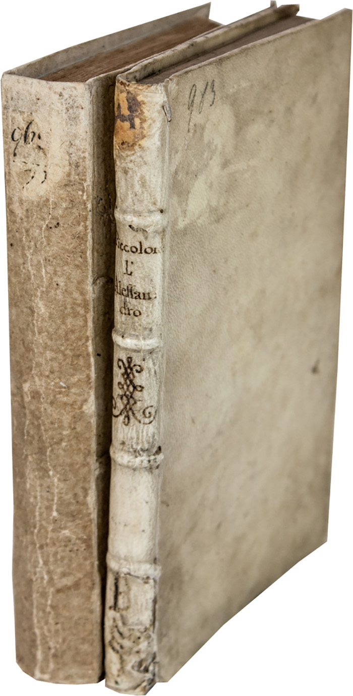 In-8° (mm 149x97). Carte 60. Marca dello stampatore incisa in legno al frontespizio. Bella copia, leggermente rifilata. Legatura coeva in pergamena rigida con minime mende. Nota di possesso di Giovan Battista Laderchi da Faenza al frontespizio e sui ex-libris applicato al verso dell'ultima carta, ex-libris del conte Camillo de Grassi al contropiatto anteriore. SI AGGIUNGE: Ghirardi Boneto, La Leonida. Comedia. In Venetia: Appresso Paolo Meietto, 1585. Cartonato moderno alla rustica. In-8° (mm 145x96). Carte [6], 136, 1 bianca (di 2). Marca tipografica al frontespizio. Primo quaderno con margini un po' più rifilati e lievi gore d'acqua e arrossature sparse ma buona copia. Cartonato rustico moderno. (2)