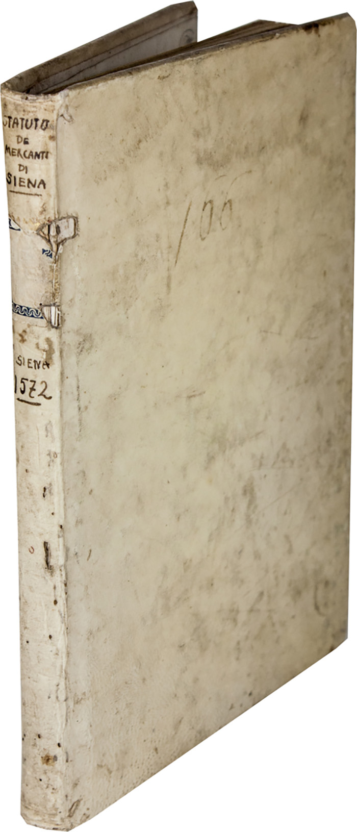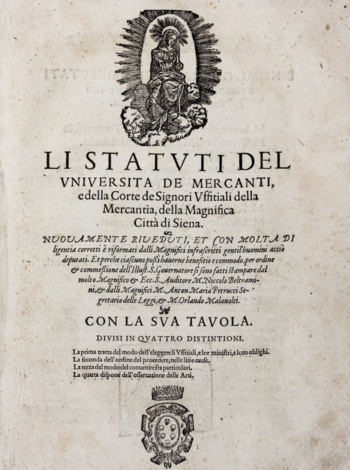 Prima rarissima edizione. Catalogo della raccolta di Statuti VII, 234-35; Manzoni II, 68. Manca a Einaudi, Goldsmiths, Kress. Il più antico statuto mercantile riguardante la totalità delle corporazioni della fiorente città di Siena risale al 1342, cui ne seguì un altro nel 1358 riformato nel 1472 e di nuovo nel 1572, anno in cui fu anche dato alle stampe per la prima volta. Si divide in 4 parti, che illustrano il Modo di eleggere li Uffitiali, l'Ordine del procedere nelle liti e cause, il Modo di convenire fra particolari, l'Osservazione delle arti.