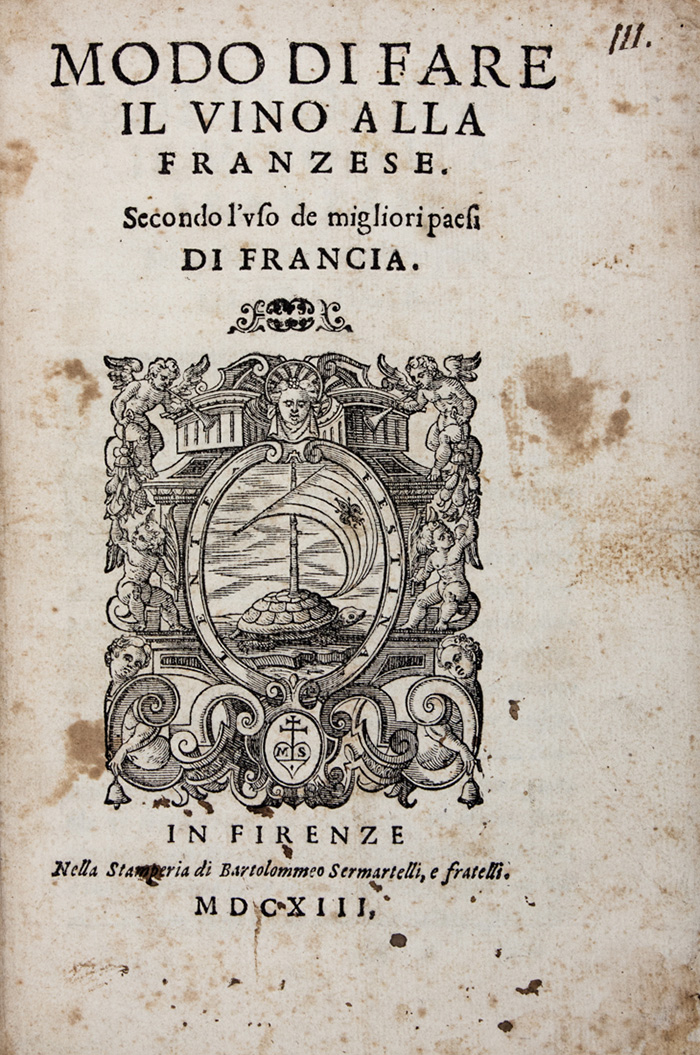 Rara placchetta, edita qui per la terza volta dopo il 1609 e il 1610. Si tratta della prima opera sugli spumanti e lo champagne. Una sola copia nelle biblioteche italiane, alla Biblioteca Nazionale di Firenze. Bibl. Vinaria 1062; Lastri 87; Sormanni 84; Westbury 154 (I e II edizione).