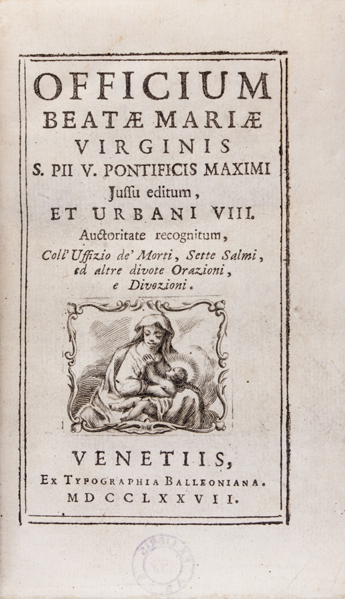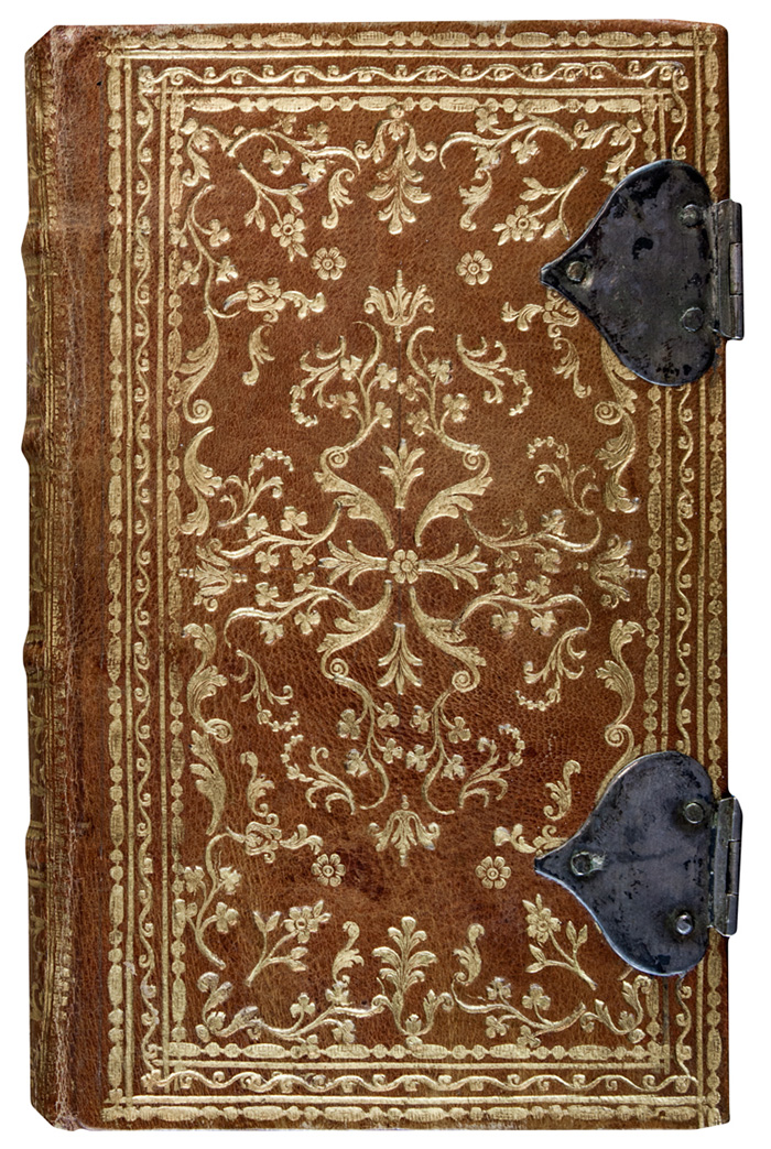 In-16° (mm 158x95). Pagine XXIII, [1], 424 con 7 incisioni nel testo. Frontespizio con marca calcografica. Forellino di tarlo nel margine interno da pagina 83 fino a pagina 103, ma buone condizioni generali dell'opera. Legatura coeva in marocchino avana dorata con due bei fermagli di chiusura con cerniere a cuore. Il libro è contenuto nel suo astuccio originale in pieno vitello, l’esterno è decorato con una serie di tripli filetti a secco a formare triangoli e a seguire la curvatura del dorso, l’interno è foderato da carta xilografata. I piatti sono inquadrati da una cornice rettangolare formata da 5 ordini di filetti con il campo centrale completamente coperto di fiori, festoni e tralci. Timbro di collezione al verso del frontespizio.