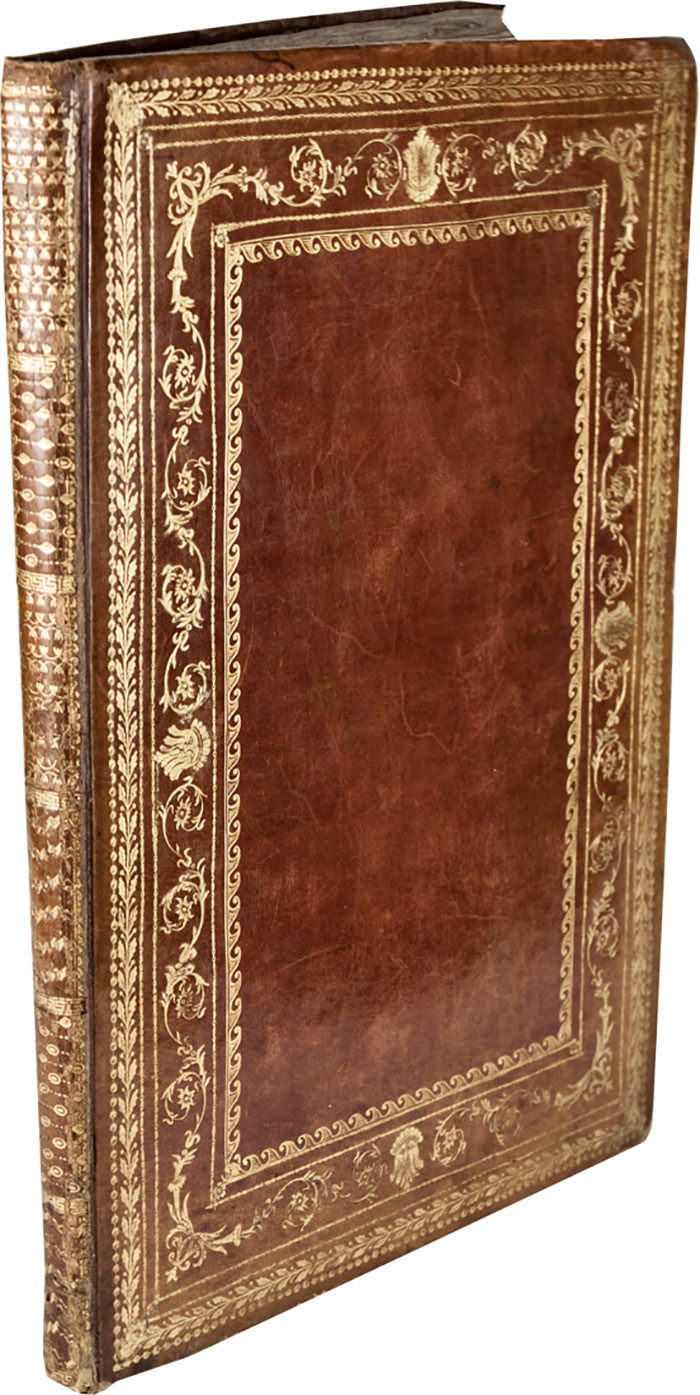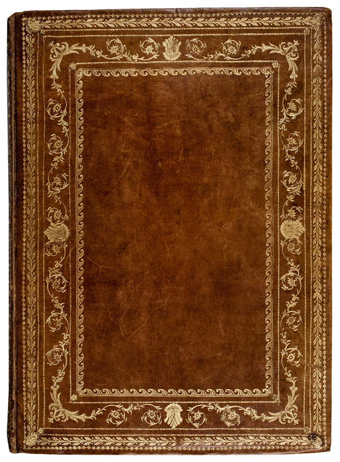 In-folio (mm 325x235). Pagine [4], 59, [1] con 6 tavole incise e ripiegate. Esemplare parzialmente intonso con tracce di foxing. Legatura coeva in vitellino avana con piatti ornati da una serie di cornici: un primo nastro eseguito con foglie floreali racchiuso da due bordi di elementi decorativi; una successiva bordura di un doppio filetto a motivi floreali; una successiva catenella, con agli angoli piccoli fiorellini. Il dorso a sei comparti è completamente coperto da piccoli ferri di tre tipologie diverse.