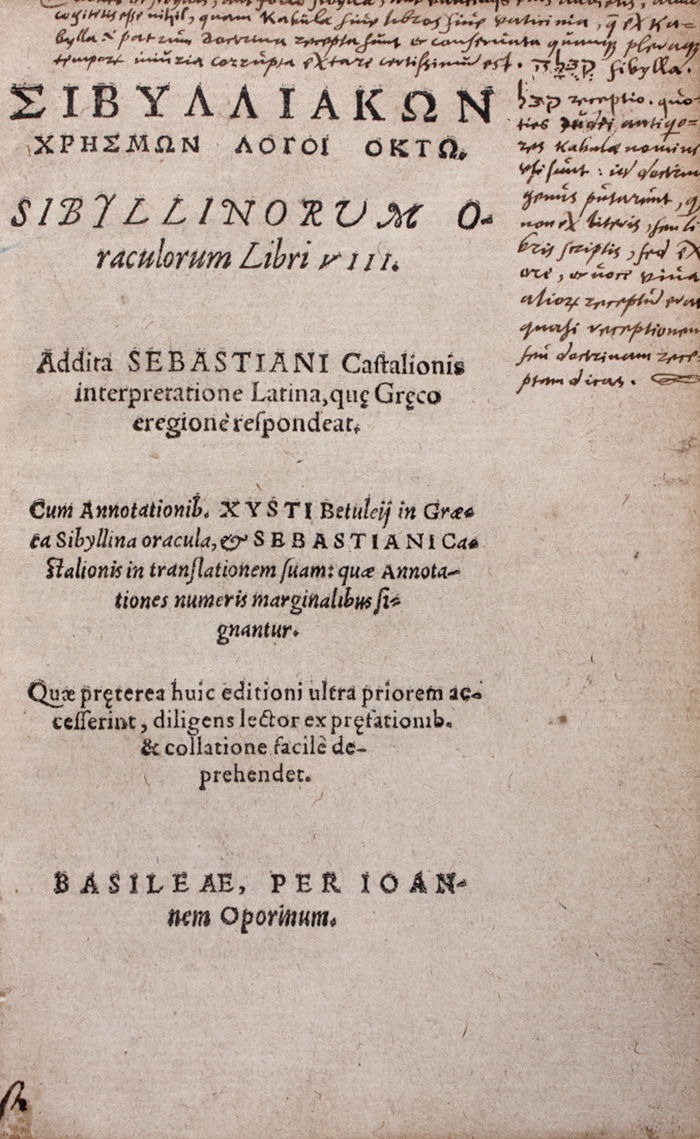 Sibylliakon chresmon logoi Okto. Sibyllinorum oraculorum libri VIII. Addita Sebastiani Castalionis interpretatione Latina, quae Graeco eregione respondeat. Cum annotationib. Xysti Betuleij...