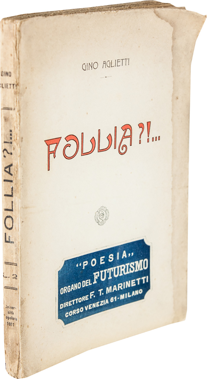 In-8° (mm 193x132). Pagine 123, [5]. Buon esemplare dai fascicoli con piccole variazioni di misure, ma in barbe. Brossura editoriale con titoli in rosso e nero al piatto anteriore ed etichetta blu con titoli dell'Organo del Futurismo "Poesia". Titoli in nero al dorso con leggere abrasioni e piccole mancanze. Lieve alone di gora d'acqua nella copertina al margine esterno.