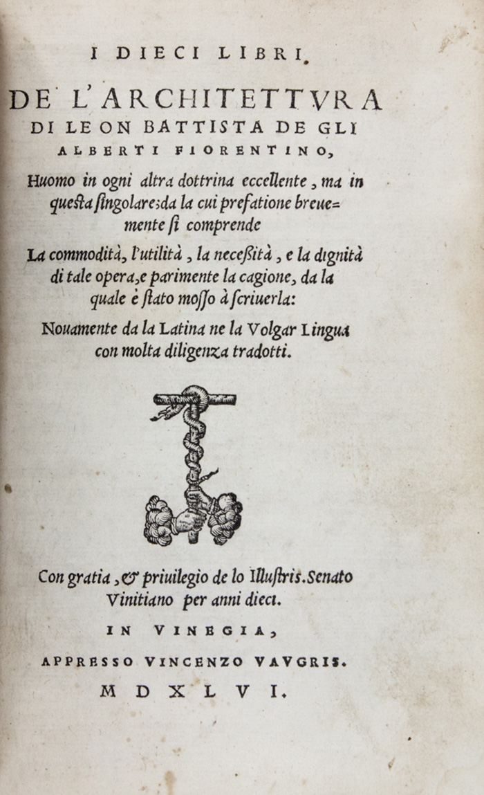 Prima rara edizione in italiano, l'unica versione. Adams A-487; Cicognara 373: «Elegante edizione»; Fowler 5: «Only edition of this first italian translation, by Pietro Lauro, of the works of Alberti».