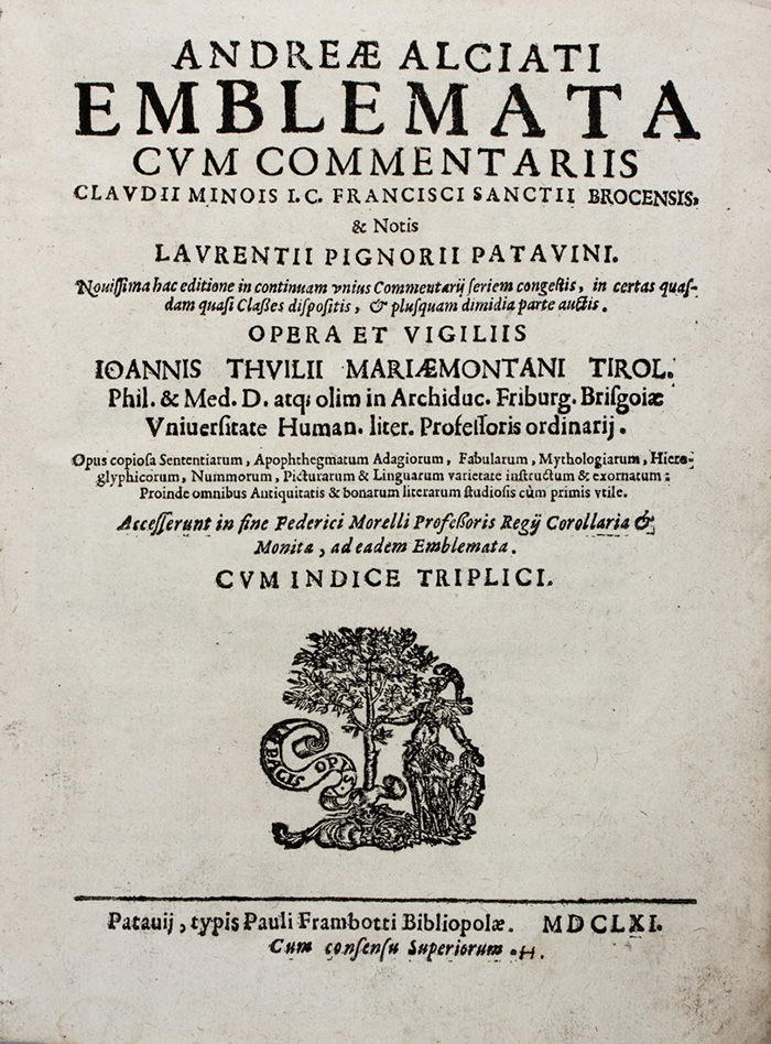 Alciati Andrea, Emblemata cum commentariis Claudii Minois I.C. Francisci Sanctii Brocensis, & notis Laurentii Pignorii...