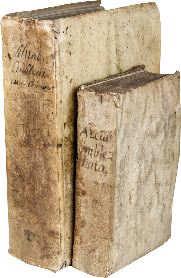 In-4° (mm 218x157). Pagine LXXX, 1001, [3]. Bel frontespizio architettonico popolato di figure allegoriche inciso in rame da Ruffoni, frontespizio tipografico con marca xilografica, ripetuta in fine e oltre 200 vignette di emblemi incise in legno a mezza pagina nel testo. Bella copia, con forellini di tarlo e lievi aloni marginali a poche carte, qualche arrossatura sparsa. Legatura coeva in pergamena molle con titoli manoscritti al dorso. SI AGGIUNGE: Id., Omnia [...] emblemata: com commentariis [...] per Claudium Minoem Divionenesem. Antuerpiae: ex officina Christophori Plantini, 1581 (Al colophon): 1580. In-8° (mm 164x110). Pagine [24], 782 [ma 776 per mancanze], [2]. Esemplare scompleto di 3 carte di testo, con molte bruniture. Legatura coeva in pergamena molle con difetti. (2)