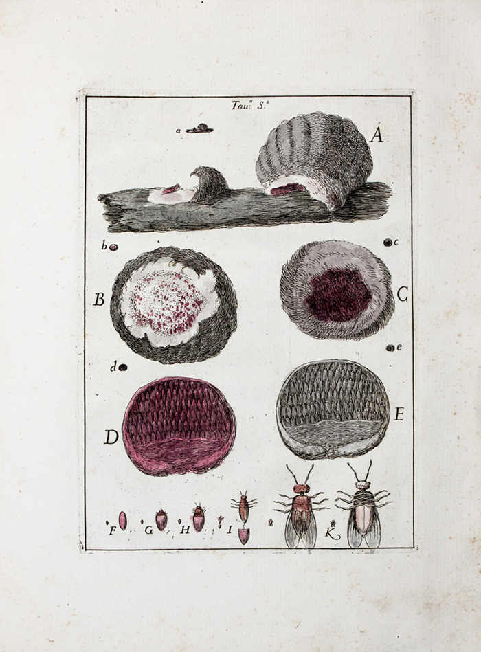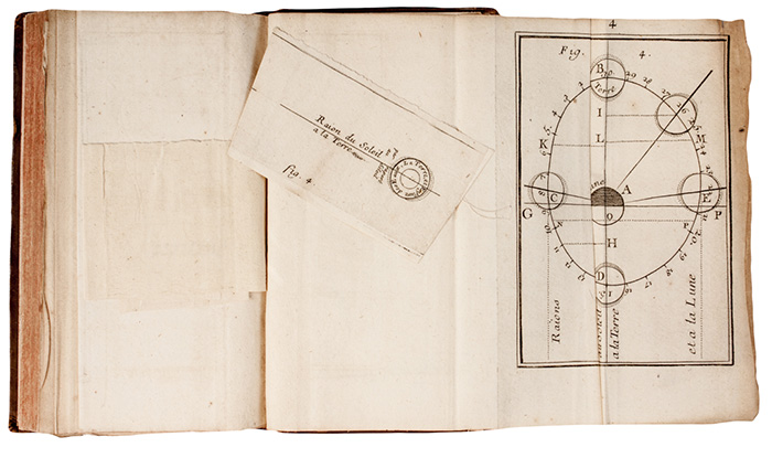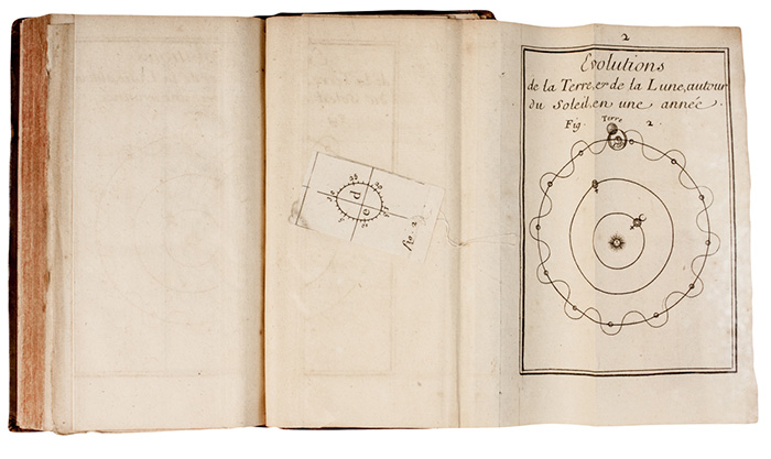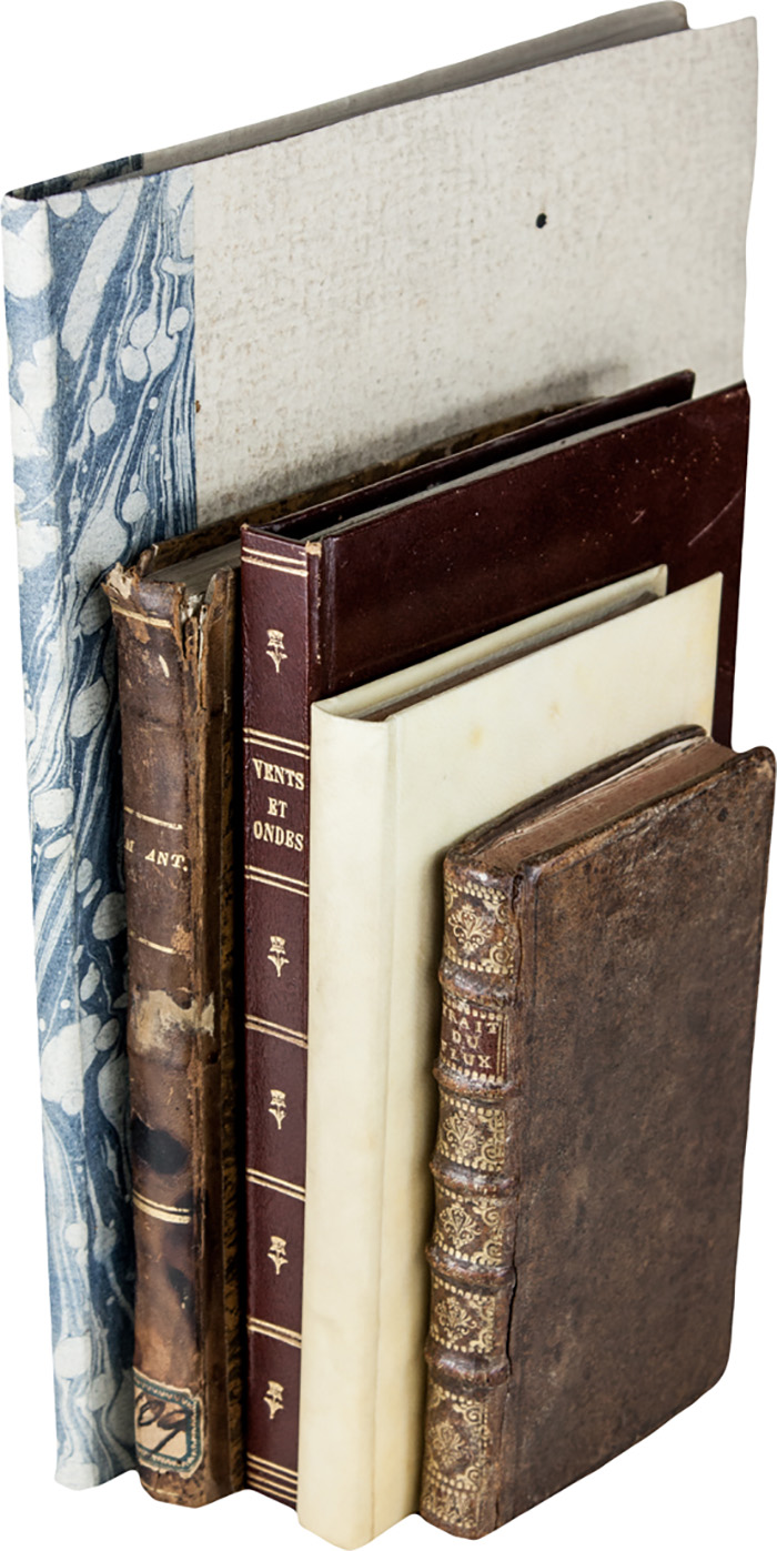 In-12° (mm 148x78). Pagine XIV, [8], 176, [6] di catalogo dello stampatore e 6 tavole numerate incise in rame ripiegate in fine, le numero 2-4 anche con parti mobili. Legatura in pieno vitello coevo, con una rottura lungo la cerniera anteriore. SI AGGIUNGE: La Coudraye François-Celestin de Loynes, Theorie des vents et des ondes. A Paris: Chez Bernard, an X [1799]. In-8° (mm 200x120). Pagine [2], 158 con un planisfero più volte ripiegato in fine. Legatura moderna in piena pelle. SI AGGIUNGE: Mocenigo Marco Antonio, De eo, quod est paradoxa, theoremata q'ue, ex Aristotelis philosophia deprompta... Venetiis: apud Cominum de Tridino, 1559. In-4° (mm 195x140). Carte 102. Frontespizio architettonico inciso in legno, capilettera figurati. Buona copia, un po' rifilata e con bruniture e fioriture al frontespizio. Legatura ottocentesca in mezza pelle, con piccole lacune al dorso e alle cerniere. SI AGGIUNGE: Marsili Luigi Ferdinando, Brieve ristretto del saggio fisico intorno alla storia del mare...Venezia: presso Andrea Poletti, 1711. In-4° (mm 270x200). Pagine [4], 72, [4]. Copia con qualche macchia, ma in ottimo stato di conservazione. Tre belle tavole a colori incise in rame in fine. Legatura successiva in cartonato con strisce di carta marmorizzata. SI AGGIUNGE: Pontanus Johannes Isaacus, Disceptationum chorographicarum adversus Phil. Cluverum... Hardevici: Typis Thomae Henrici, 1617. In-8° (mm 170x100). La sola seconda parte completa di testo, ma con arrossature e fioriture nella parte centrale del volume, rilegata in pergamena muta moderna. (5)