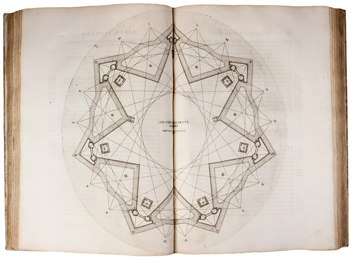 Prima edizione. «Oltre il merito intrinseco vanta quest'opera ancor quello di essere stampata con magnificenza. La qualità della carta, l'ampiezza del margine, la forma de' caratteri, l'incisione delle tavole concorrono tutte insieme a rendere pregevole l'edizione, la quale è al certo superiore a tutte le altre di quel secolo che trattano di fortificazioni...». Cfr. Adams I-742; Cockle 778; D'Ayala 83; Marini 27-29.