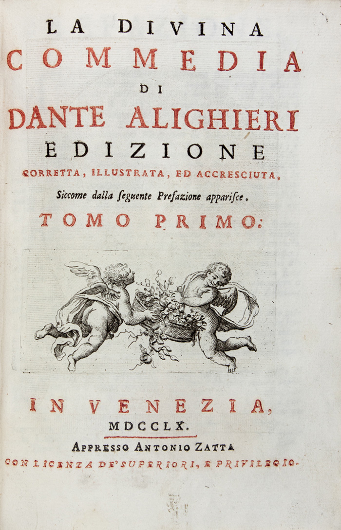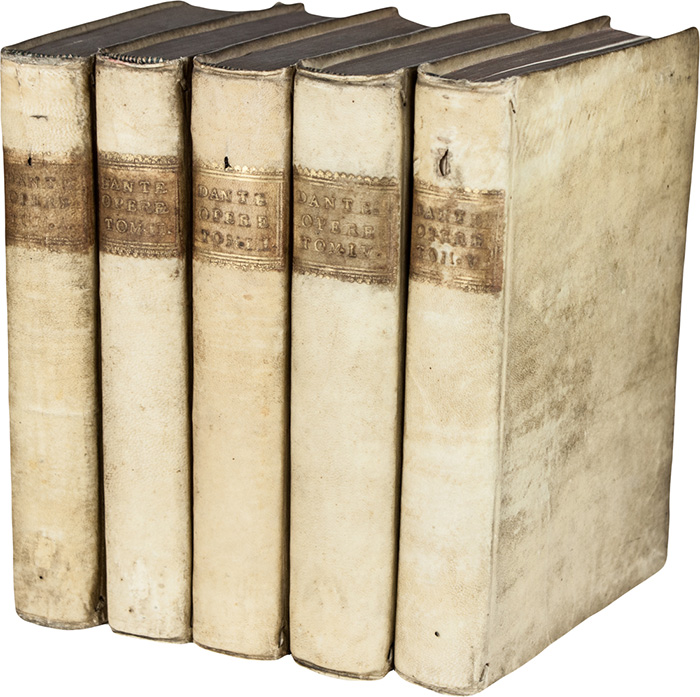 7 parti in 5 volumi in-8° (mm 188x125). Pagine [8], XXX, 414, [2] con 1 ritratto di Dante in antiporta e 2 incisioni in rame a piena pagina, di cui una fuori testo; VIII, 423, [1]; VIII, 470, [2]; [4], 120, [4], 162, [6], 165-272, XCIX, [1] con 1 tavola di albero genealogico fuori testo più volte ripiegata; [2], 287, [3], [4], 291-480. Frontespizio del primo volume stampato in inchiostro rosso e nero, vignette calcografiche ai frontespizi popolate di puttini e 3 graziose testatine xilografiche in principio di ciascuna cantica. Minimi strappetti marginali a due carte, piccoli forellini di tarlo a circa 30 carte del II volume ma buona copia. Legatura coeva in piena pergamena rigida con titoli impressi in oro su falso tassello al dorso. Ex-libris Confalonieri Stratman manoscritto ai contropiatti. (5)