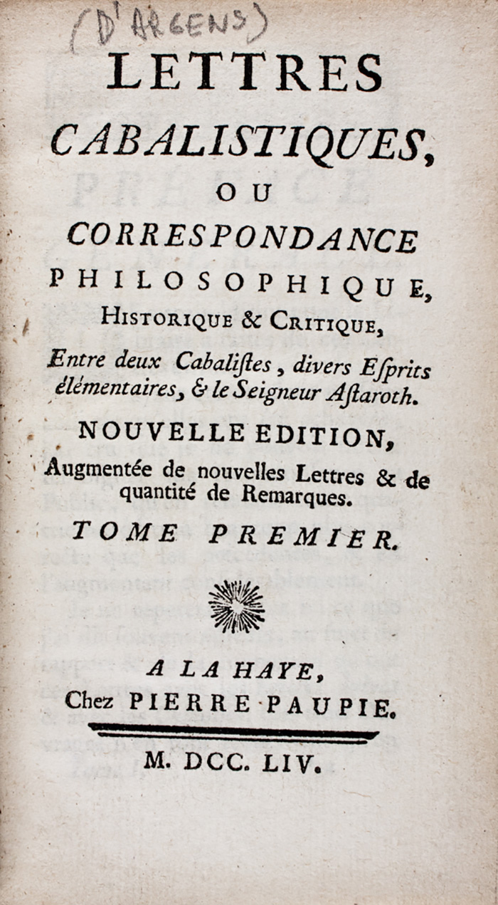 Argens Jean-Baptiste de Boyer (marchese di), Lettres cabalistiques ou correspondence philosophique, historique & critique entre deux cabalistes, divers esprits elementaires & le seigneur Astaroth...