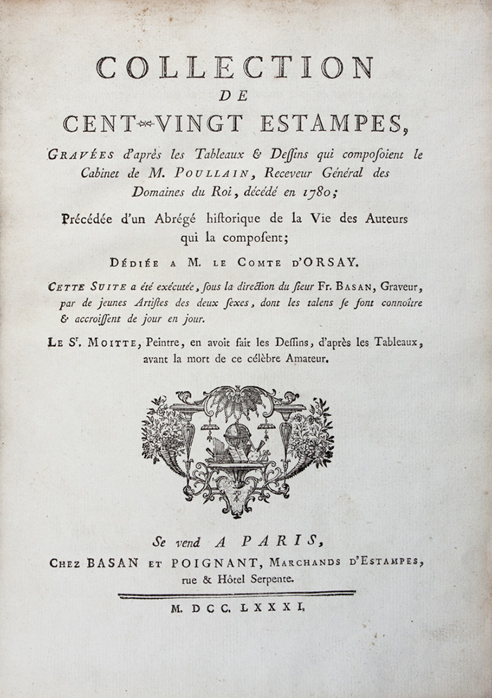 Prima ed unica edizione. Le 120 tavole incise all'acquaforte e bulino da Dambrun, Choffard, Legrand, de Longueil, Martini, Weisbrod, Guttenberg, Zentner e molti altri su disegni di Moitte riproducono le opere della magnifica collezione Poullain, che includeva anche dipinti di Veronese, Rembrandt, Rubens e Van Dyck. Cfr. Brunet I, 686; Cohen-Ricci 116.