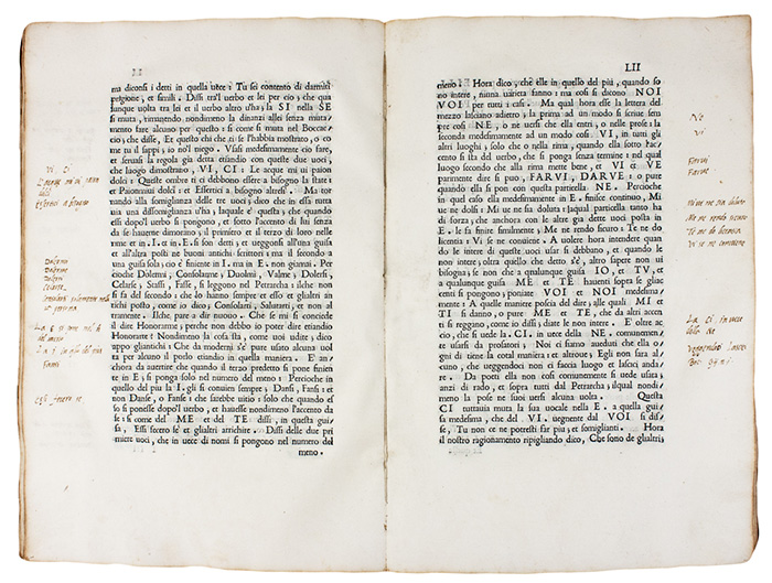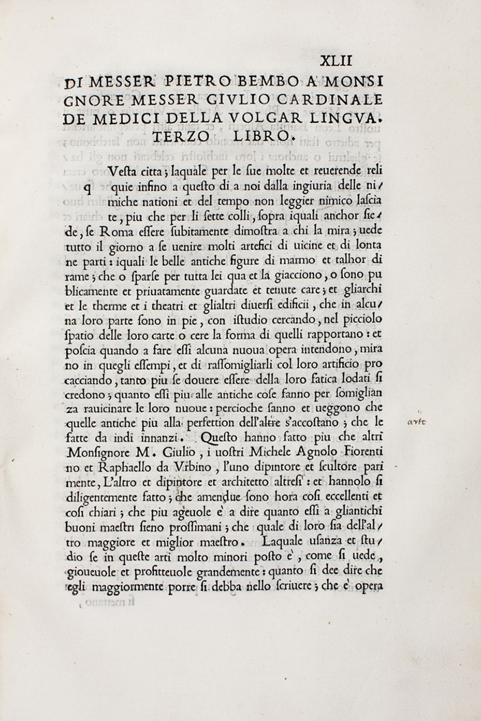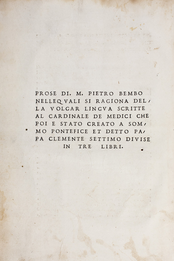 Prima edizione in prima tiratura. Gli studi di Pollidori Castellani e poi di Vela hanno permesso di stabilire che le copie che presentano a carta 42r la correzione a mano "dell'arte" in luogo del testo a stampa "dell'altre", effettuata da Cola Bruno, appartengono con certezza alla rarissima tiratura originale. Cfr. Vela 2001, 53: Cola Bruno, fedele segretario del Bembo, era in quel momento a Venezia per sovrintendere alla stampa delle Prose della volgar lingua, ed effettuò la correzione secondo le indicazioni dategli dell'Autore con cui era in costante contatto epistolare; «la distribuzione sarà iniziata dopo la correzione manuale dell'errore sulle copie dell'intera tiratura». Questo trattato in volgare scritto in forma di dialogo tra Federico Fregoso, Giuliano de' Medici, Ercole Strozzi e Carlo Bembo ambientato a Venezia prima del 1502, come è noto è il capolavoro del Bembo e uno dei più autorevoli e più importanti contributi al dibattito cinquecentesco sulla questione della lingua. Brunet I, 765; Ebert 1915; Gamba 136; Graesse I, 332.