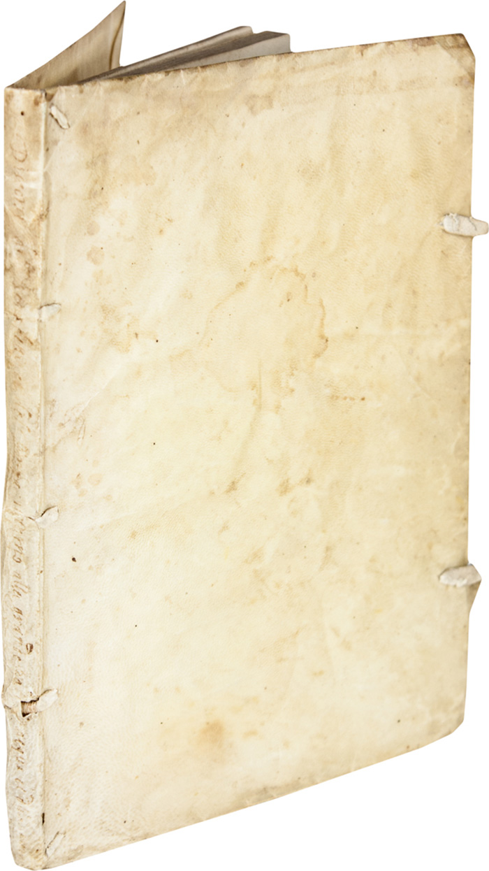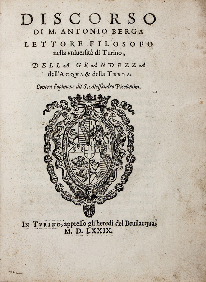 2 opere in 1 volume in-4° (mm 225x170). Pagine 43, 1. LEGATO CON: Benedetti Giovanni Battista, Consideratione [...] d'intorno al Discorso della grandezza della Terra & dell'Acqua. In Turino: presso gli heredi del Bevilacqua, 1579. Pagine 53 [3]. Stemma del Dedicatario Carlo Emanuele di Savoia inciso in legno su entrambi i frontespizi. Bella copia pur con alcune lievi arrossature sparse, più accentuate nella seconda opera. Legatura muta coeva in pergamena molle con lacci in parte mancanti.