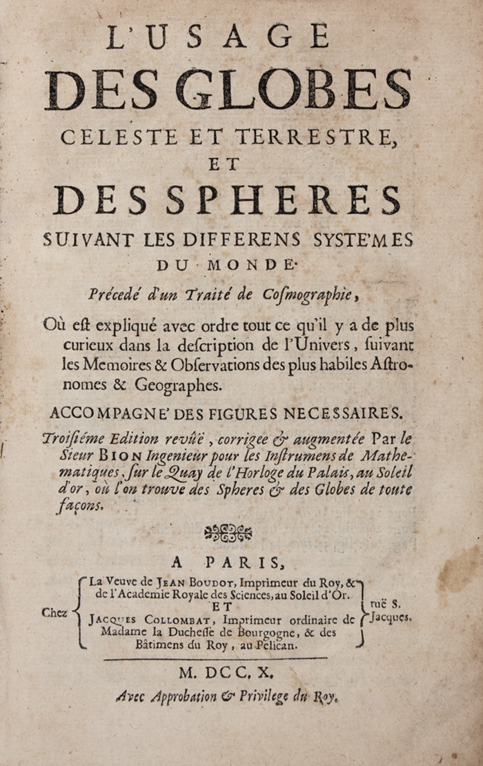 Bion Nicolas, L'Usage des globes céleste et terrestre, et des sphéres...