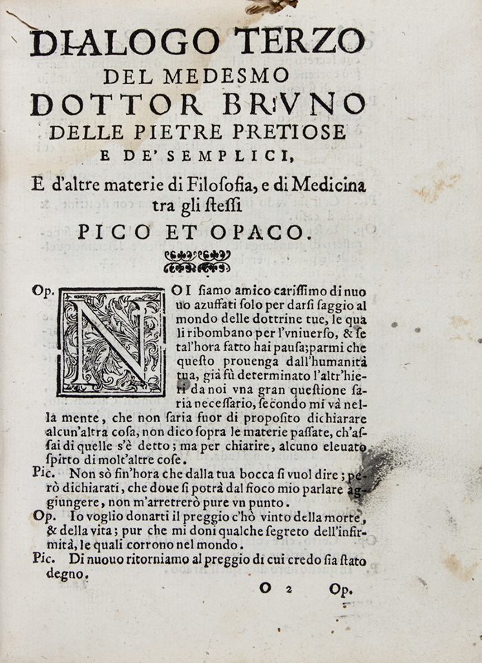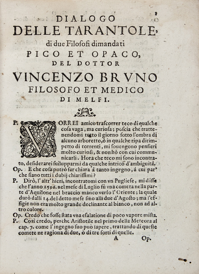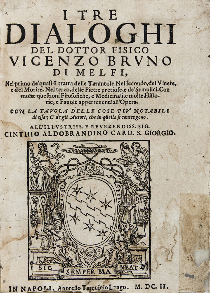 Copia mediocre e scompleta di libro raro e celebre, in prima edizione. Dei tre Dialoghi qui raccolti, quello che assicurò la notorietà al suo Autore, il medico e filosofo di Melfi Vincenzo Bruno, fu il primo: il Dialogo delle tarantole di due Filosofi dimandati Pico et Opaco. In questo dialogo si tratta infatti del tarantismo, e più in particolare di uno specifico episodio accorso a Venosa, città della Basilicata poco distante da Melfi, nell'estate del 1596. Con l'apparizione di una cometa dal 14 luglio al 2 agosto si verificarono diversi avvenimenti portentosi, come il risveglio di numerose tarantole che morsero molti degli abitanti inducendoli a comportamenti bizzarri e stravaganti. Manca a Brunet e Gamba, che citano altra opera dell'Autore, Piantanida e Pitrè. Cfr. Haym 585.3.